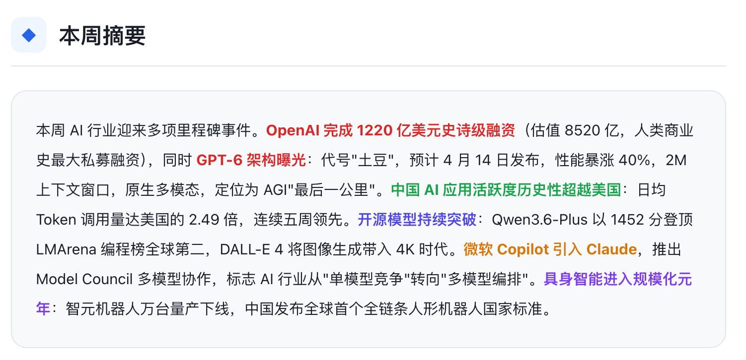 - 6 个一级分类(前沿模型、AI Agent、基础设施、开发工具链、行业政策、前沿概念)
