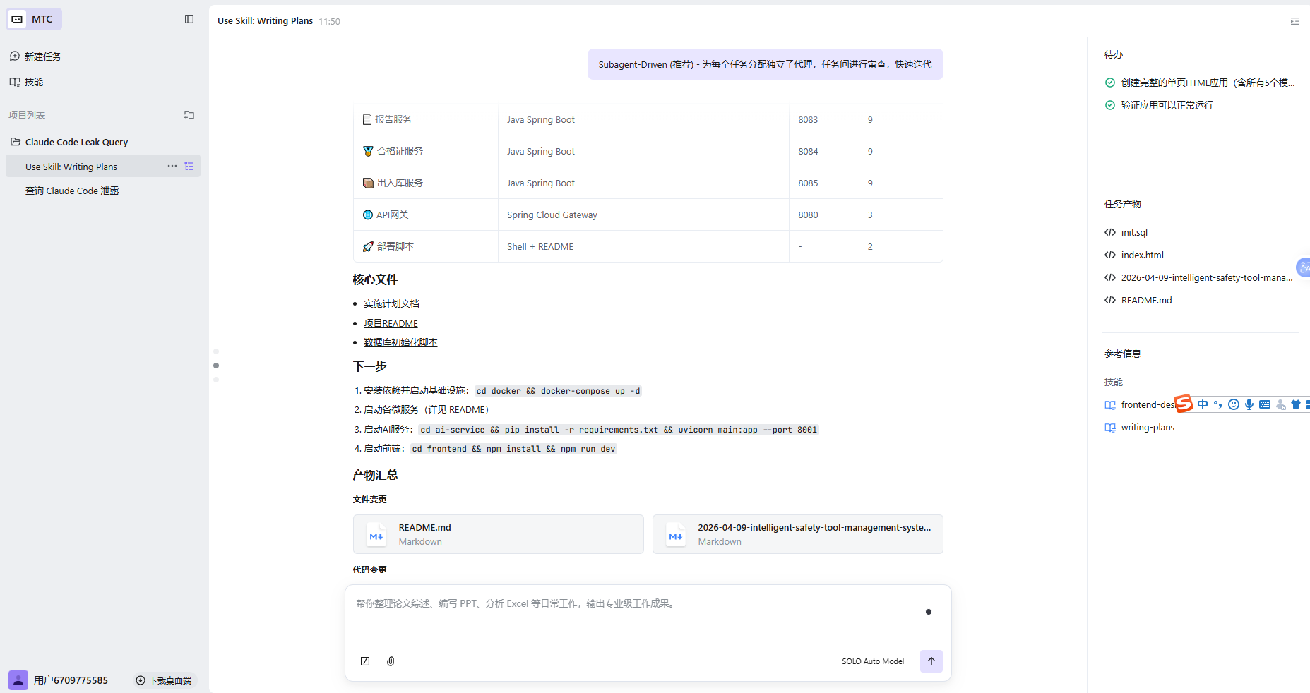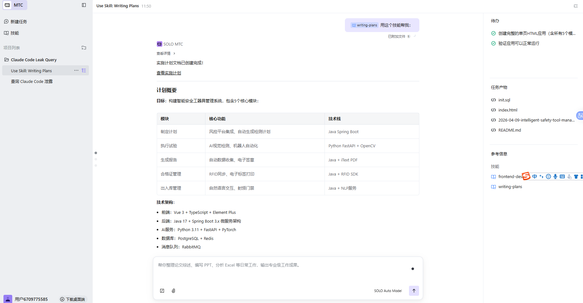 SOLO 自动生成的实施计划,包含11个任务、完整的代码示例、数据库设计、部署方案: