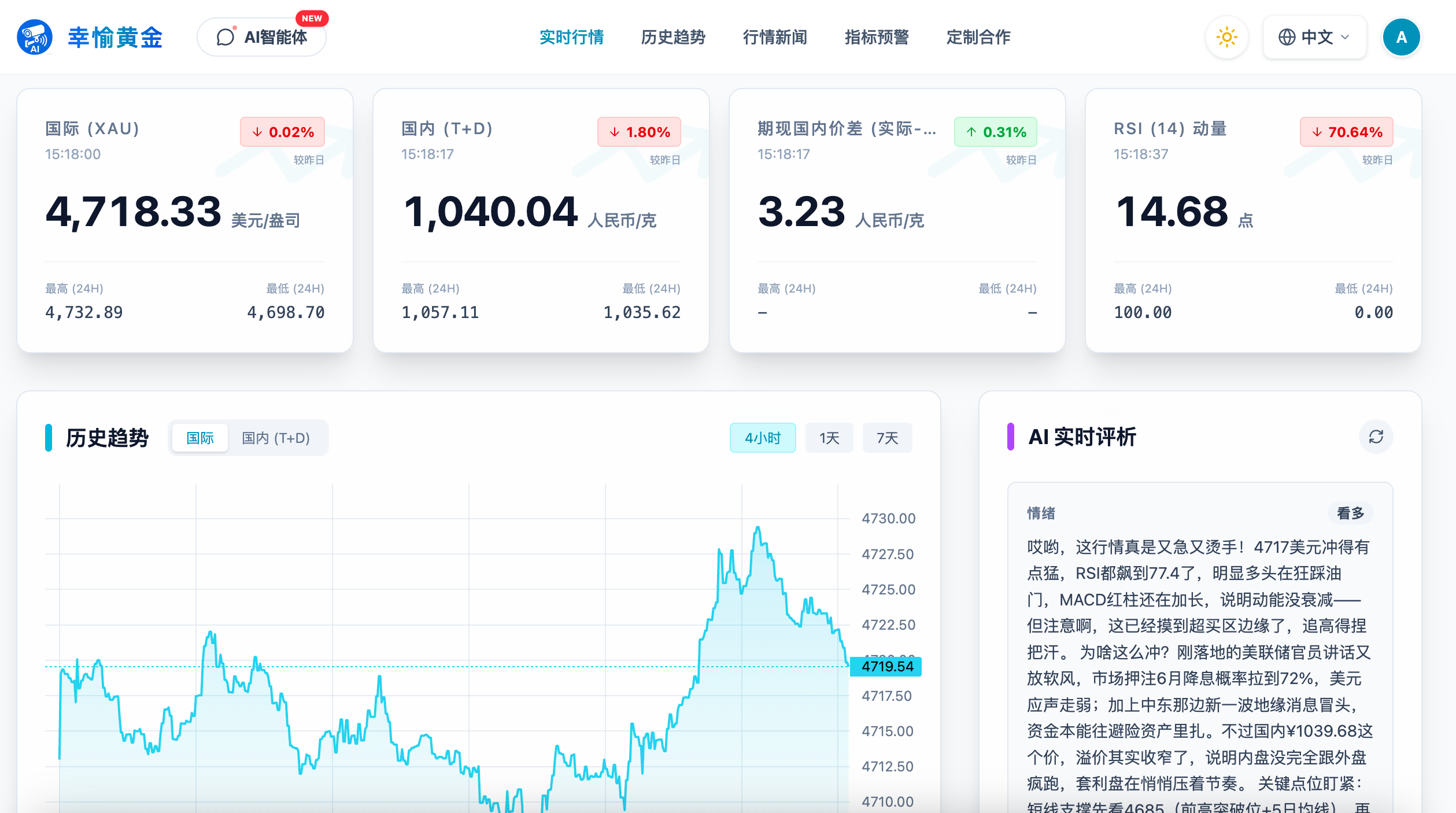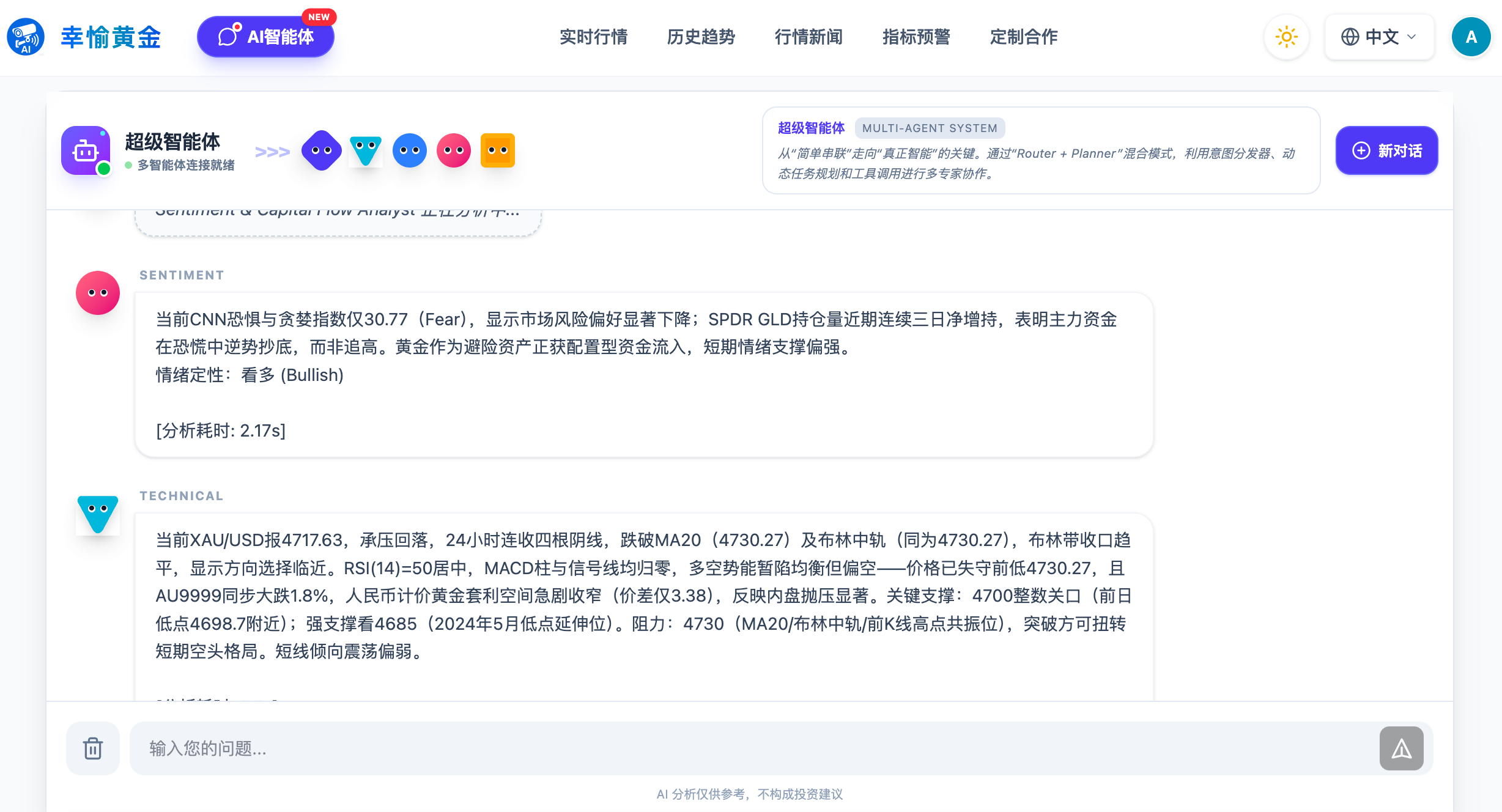 用 TRAE SOLO 完成一人全流程开发,快速实现产品 mvp 以及找到了产品迭代的方向。黄金分析智能体系统主要包括几个板块:实时金价爬取、历史价格图、AI 实时评析、相关新闻爬取、智能黄金 AI分析(多 agent 应用)。