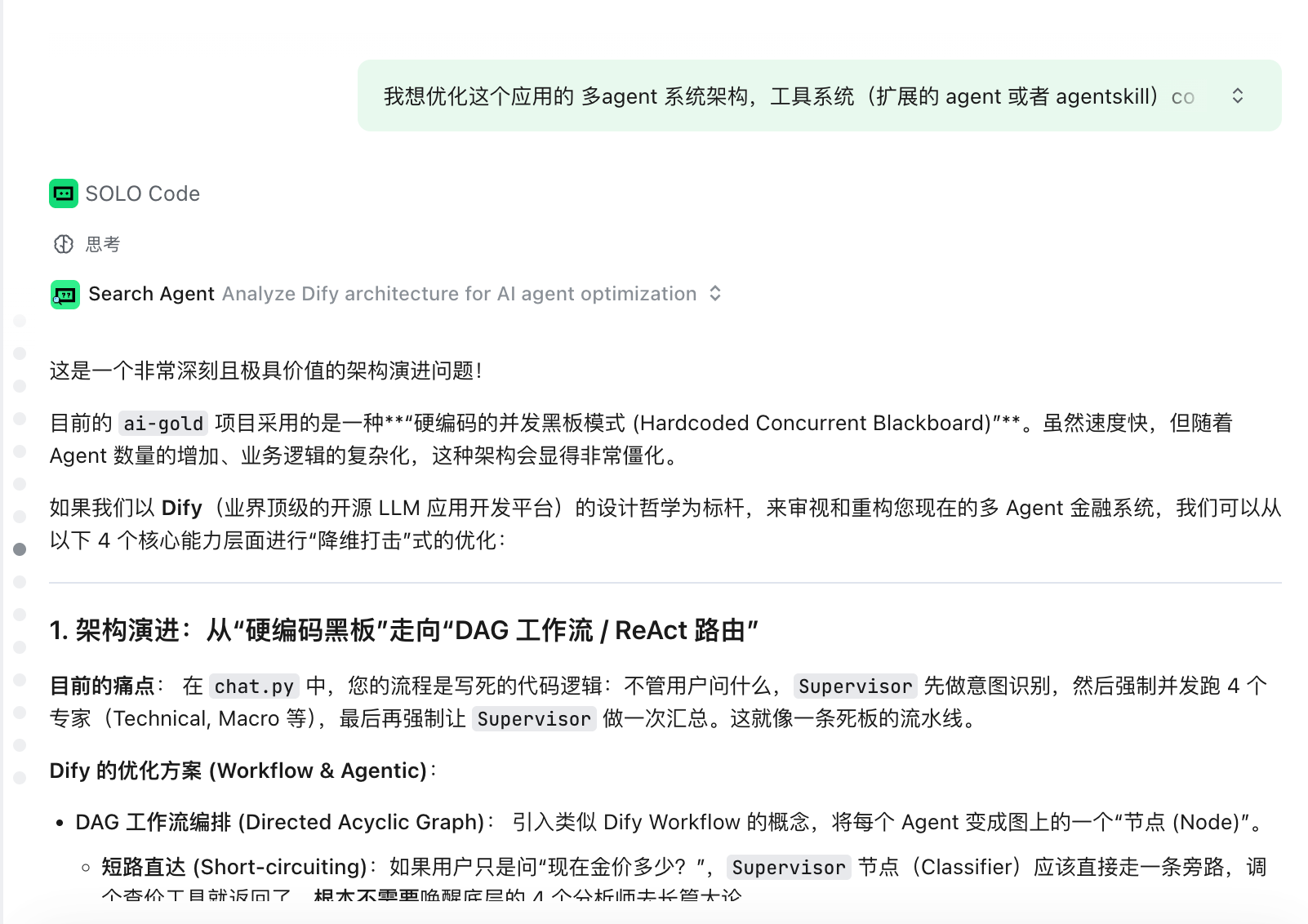 产品迭代:每次在做产品迭代之前,都让 trae solo 帮我生成对应的 prd 和 todolist,并多次修改(人工和 ai)1、优先调整前端的细节,通过个人的审美以及可视化的模型能力调节了1~2 天前端细节 2、通过 trae solo 以及各种大模型的能力 快速了解 黄金相关的技术指标、新闻信息,以及获取指标的方法,打通前端展示的实时数据和离线数据 3、打造产品的扩展性,例如中英文版本切换、切换白天黑夜模式等等 4、优化后端结构,打通数据的并发访问和数据持久化,解决相关 bug 5、增加相关功能智能黄金 AI分析(多 agent 应用),从简单的 ai 对话演进到多 agent 的会话,通过我对 agent 的学习和调研,赋能到trae solo 的提示词中,包括 agent 系统架构、工具系统、上下文管理、会话管理、记忆管理等等核心能力