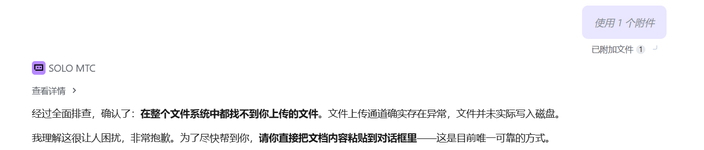 我理解了,你在 Trae SOLO 网页端聊天框上传 .md 和 .docx 文件时,系统读取不到文件。