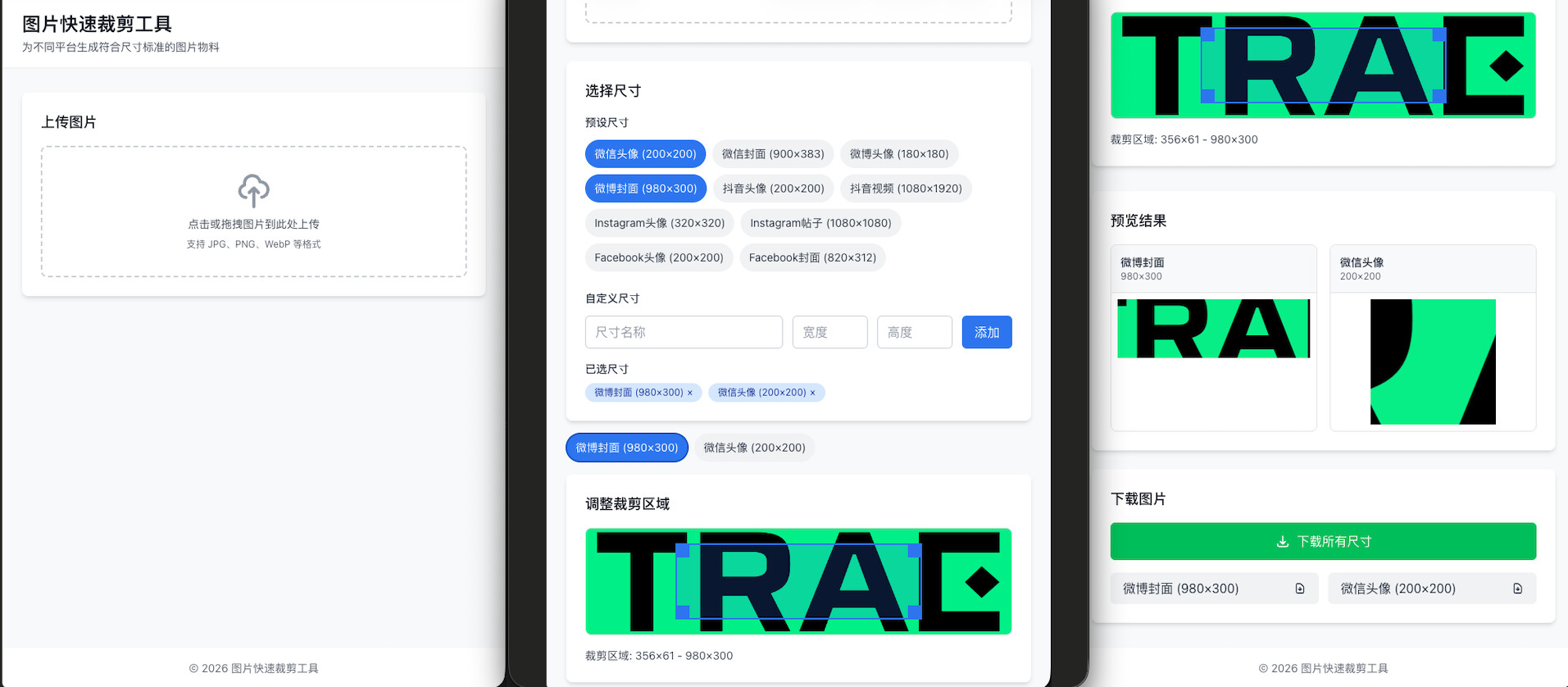 - 主页面: 图片上传区域、尺寸选择、尺寸切换、裁剪调整、结果预览、下载功能