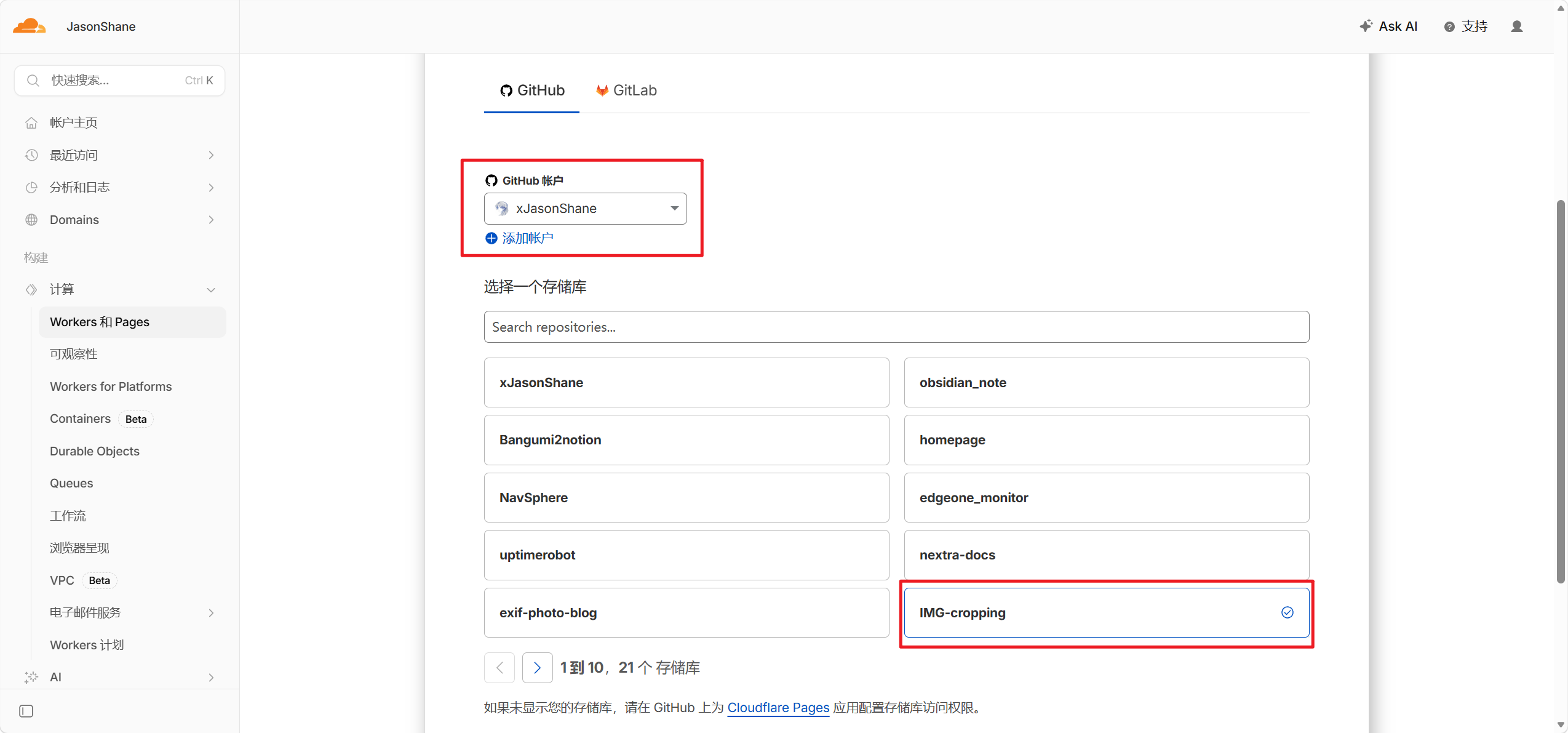 - 选择github账号和需要部署的仓库