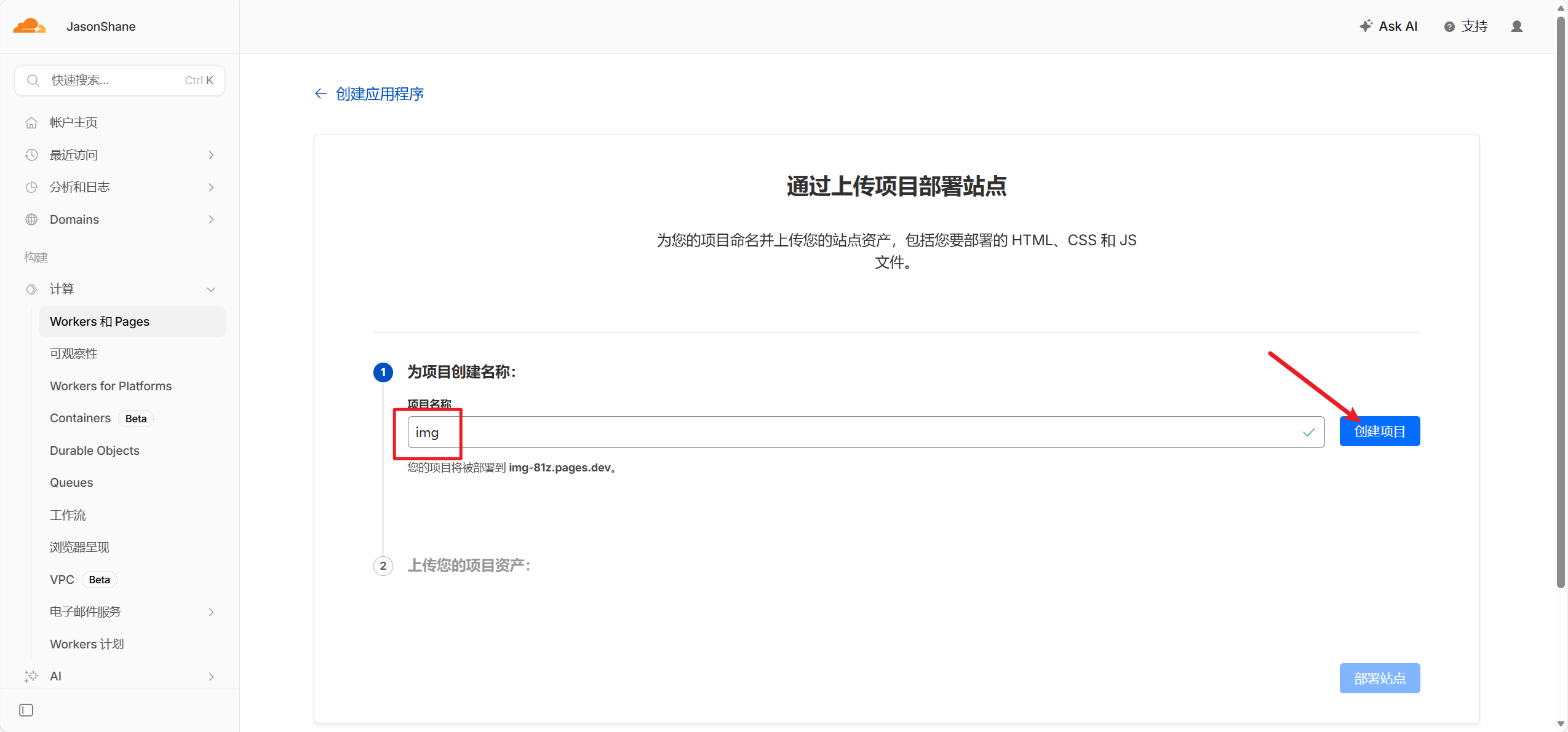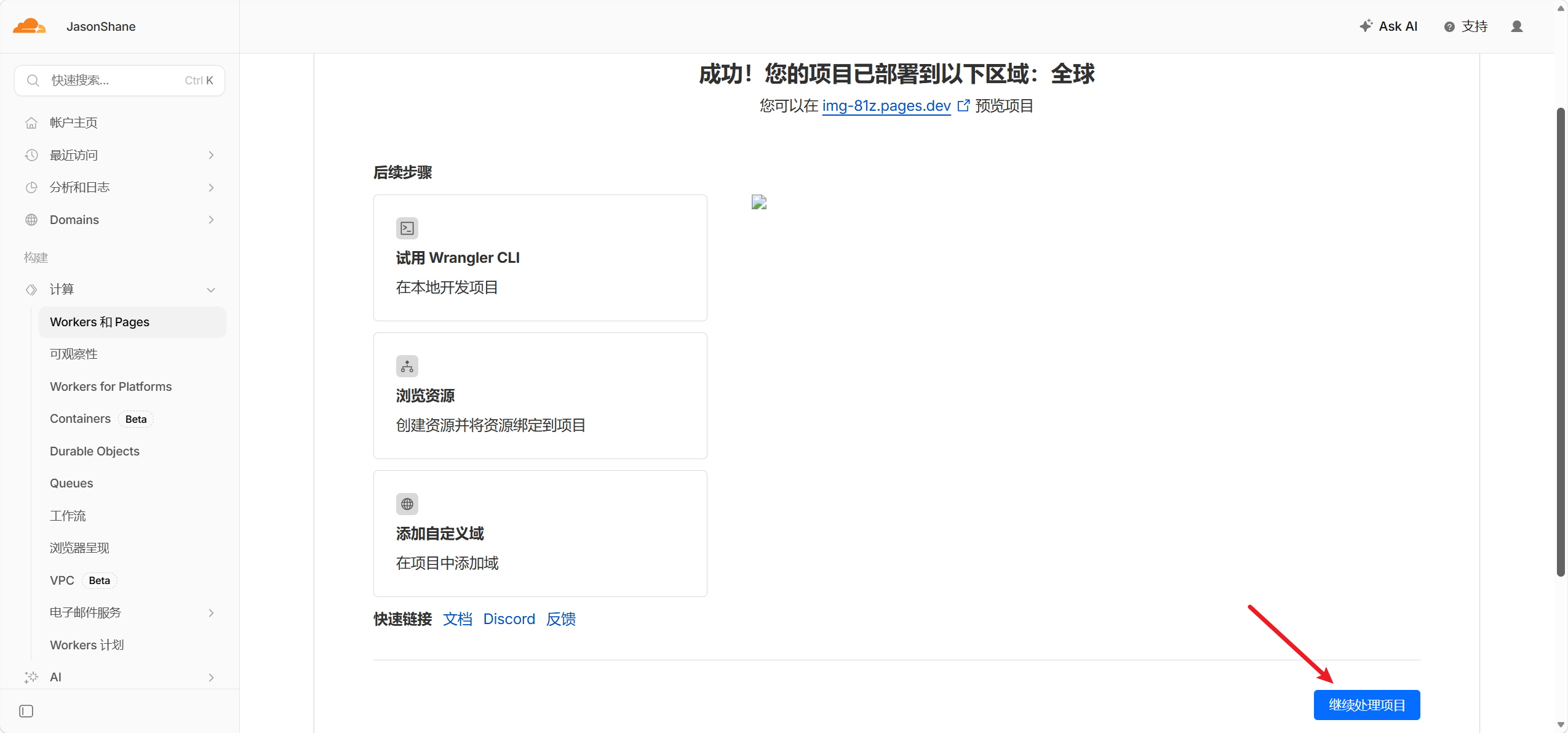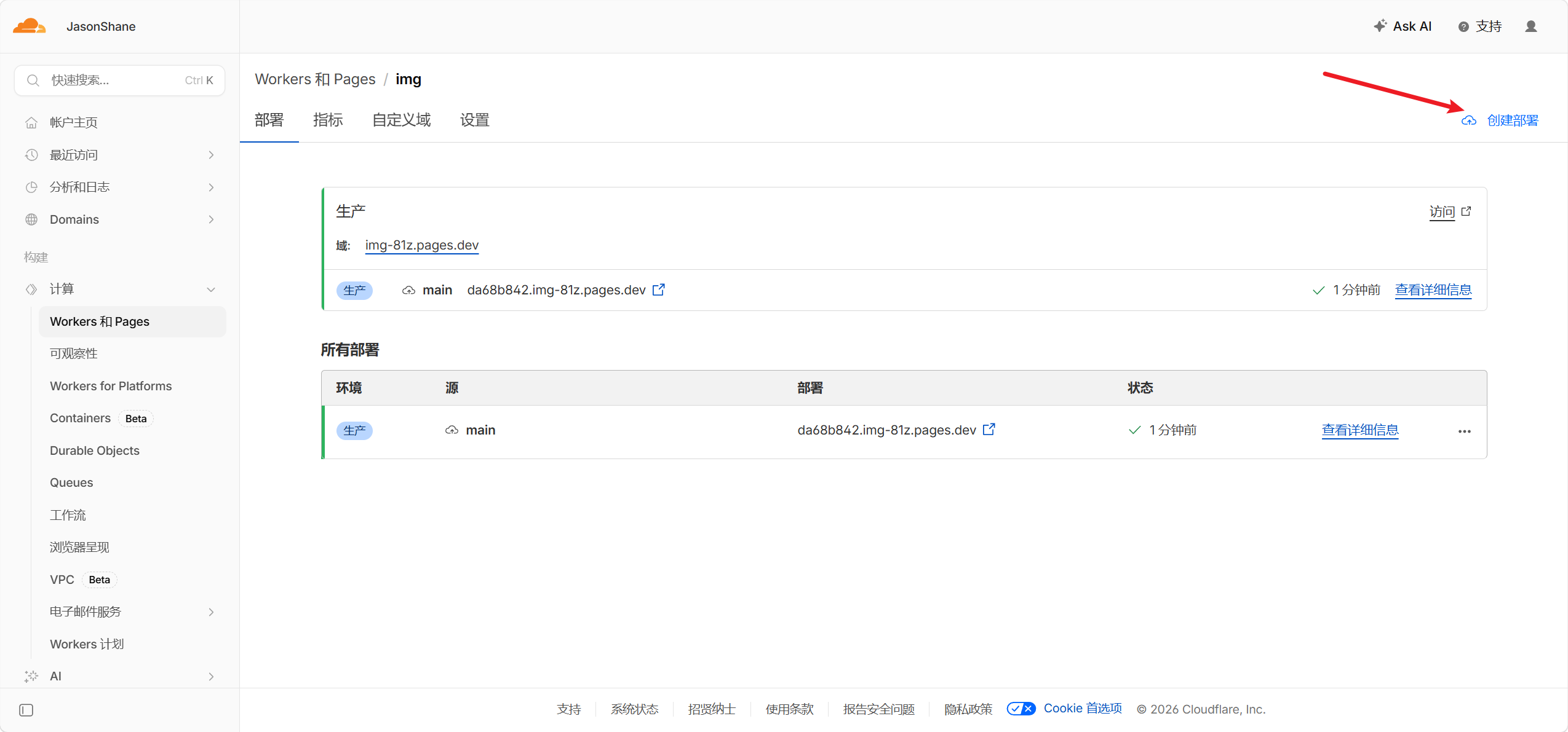 - 后续更新可以点击项目中的创建部署(域名绑定也可以在自定义域处进行更改绑定)