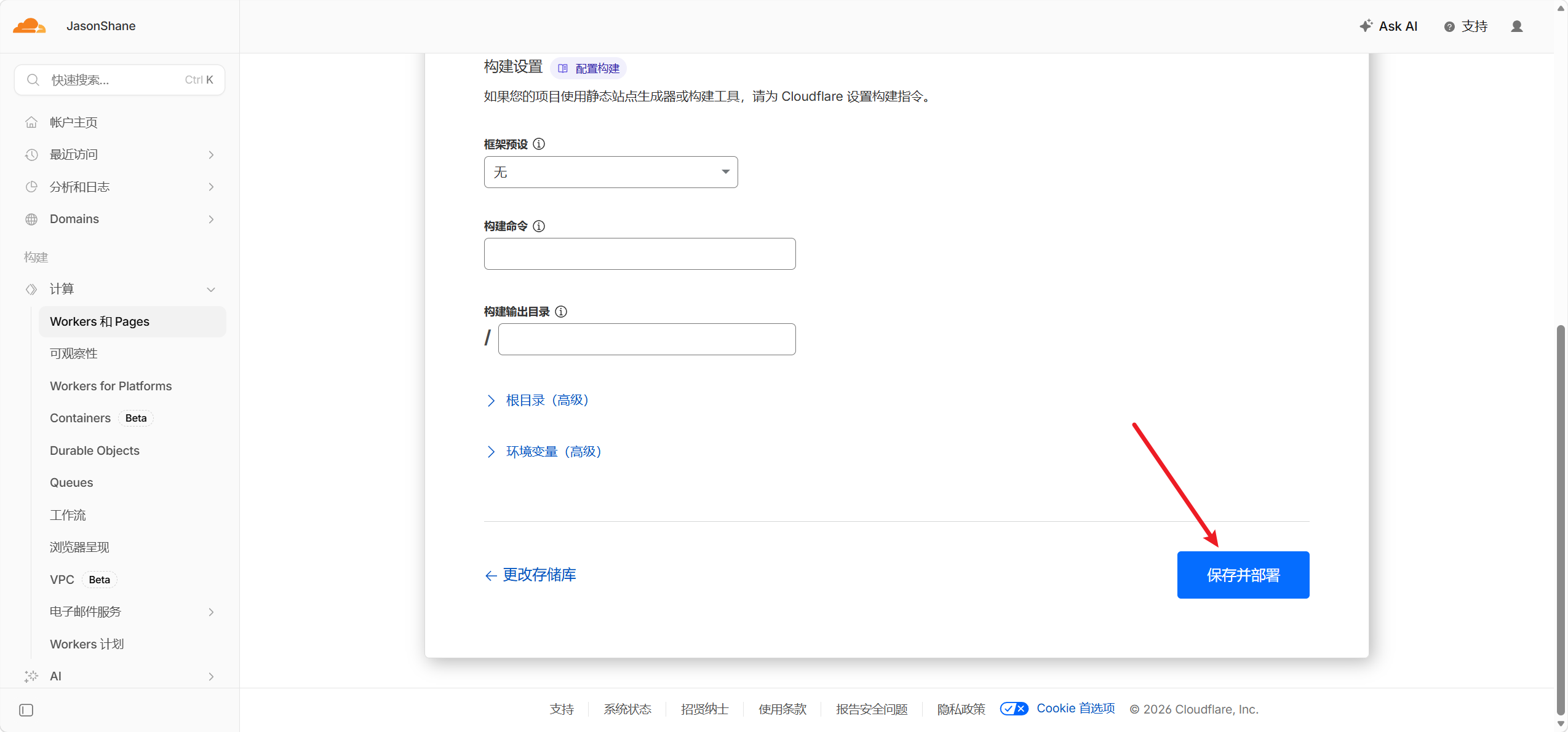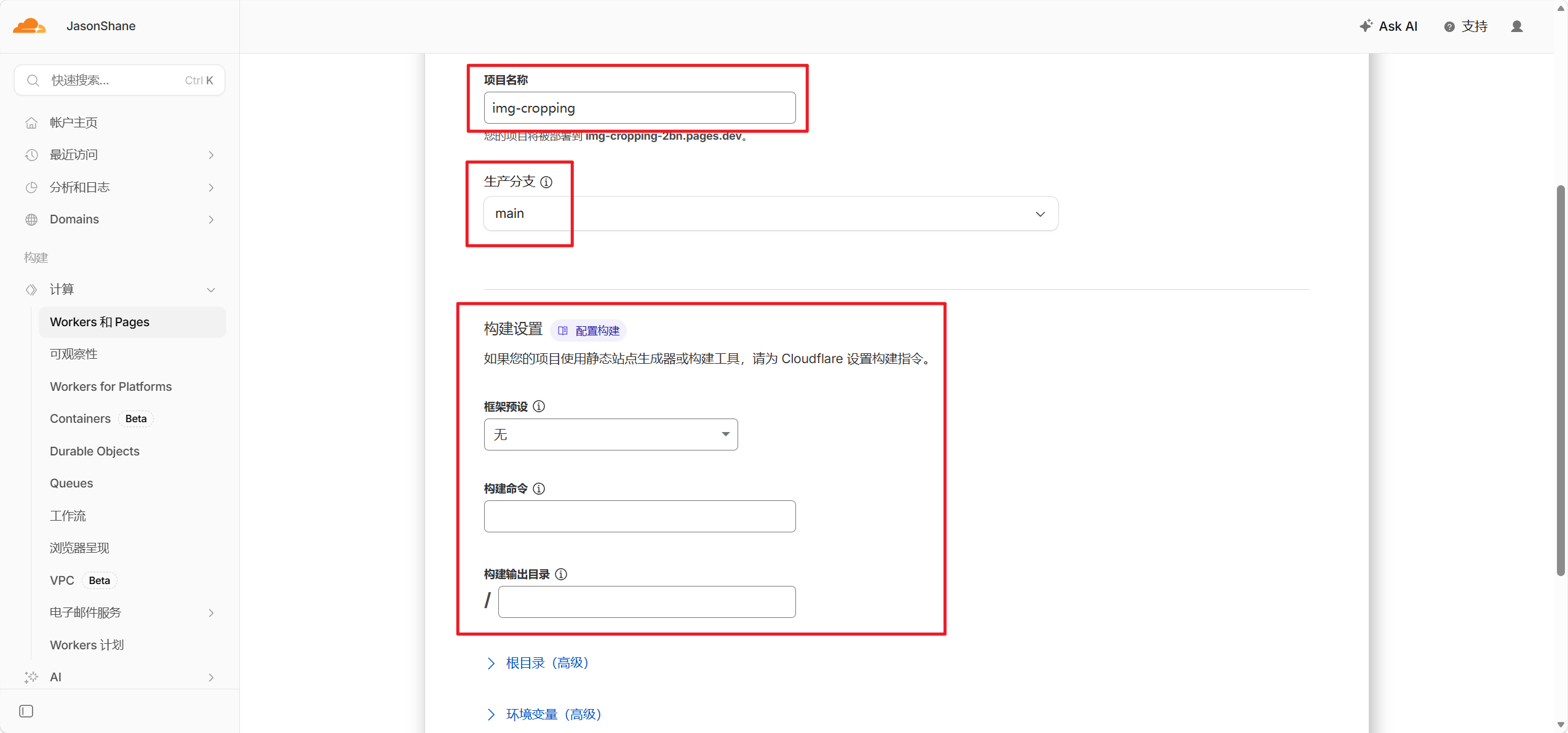 - 默认项目名称同仓库名称全小写,选择正确的生产分支,设置正确的构建设置(不知道为啥cloudflare没有识别这个项目的框架,不过不填有的框架影响也不大,如果你的项目涉及框架,一般会自动检索并自动填写,如果不确定,问TRAE!)
