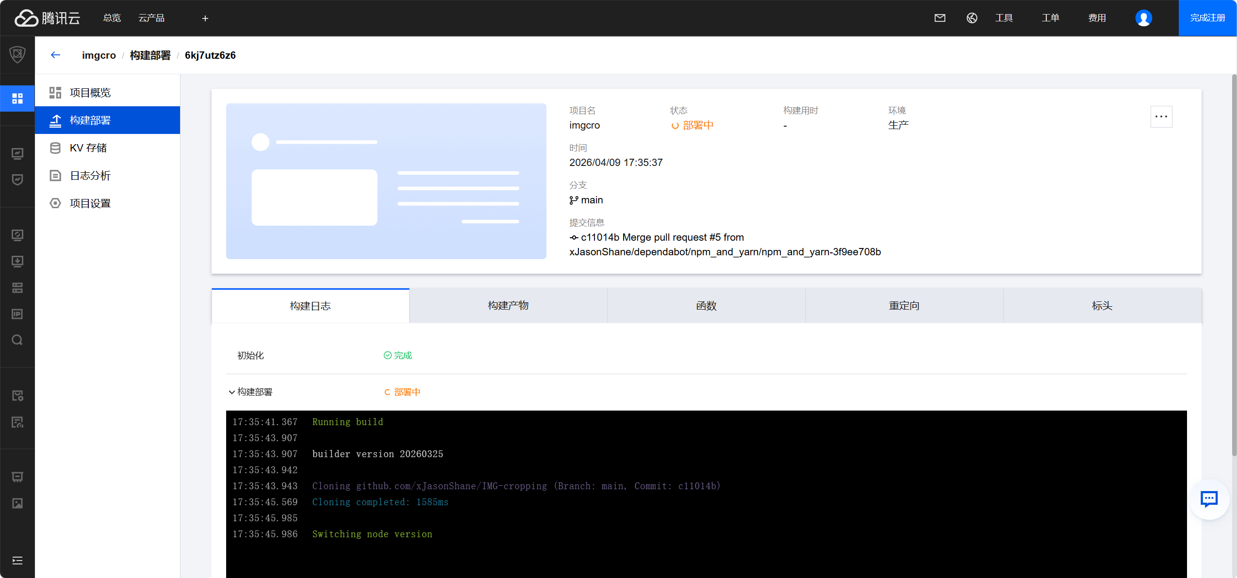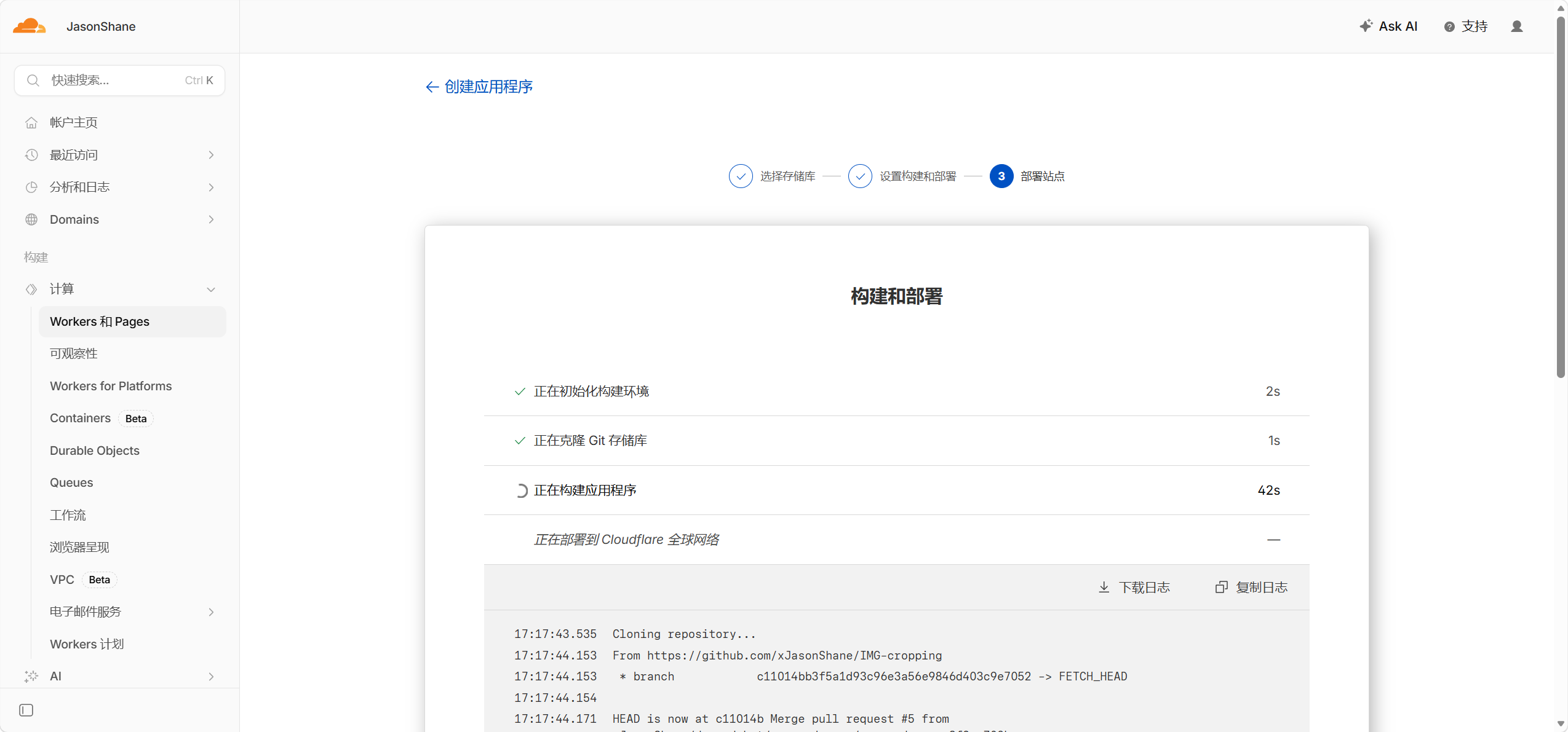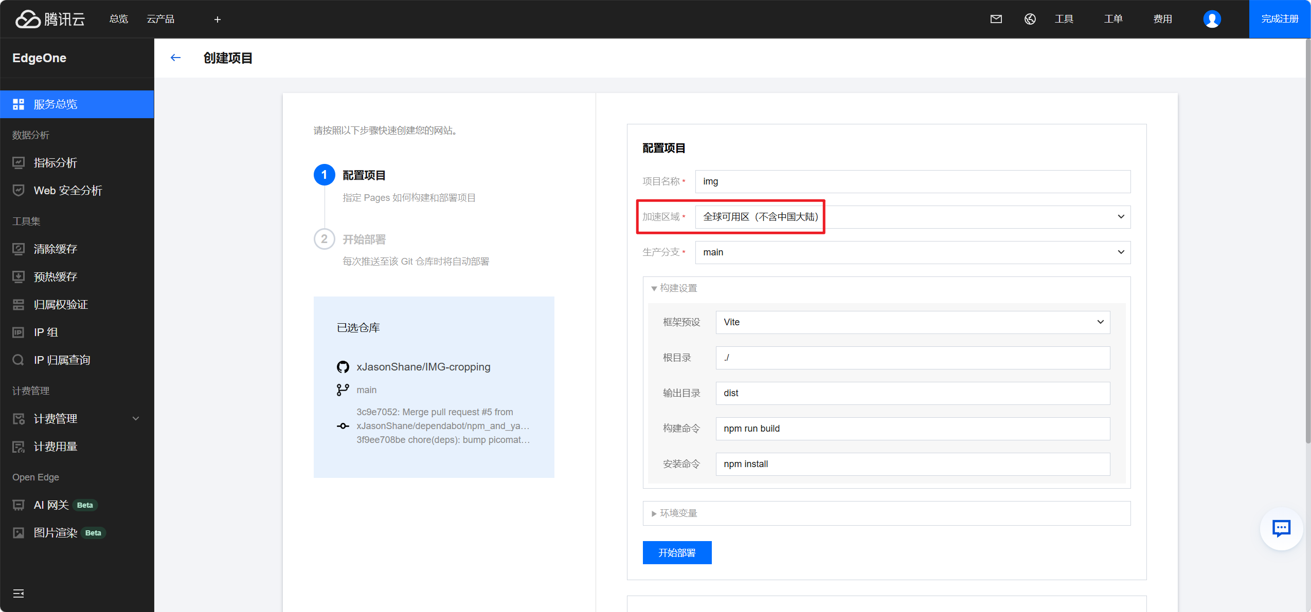 全球可用区(不含中国大陆),如果你已备案和实名认证可以选择含中国大陆,同样构建设置同上述教程,点击开始部署进入部署ing页面,等待部署完成即可!
