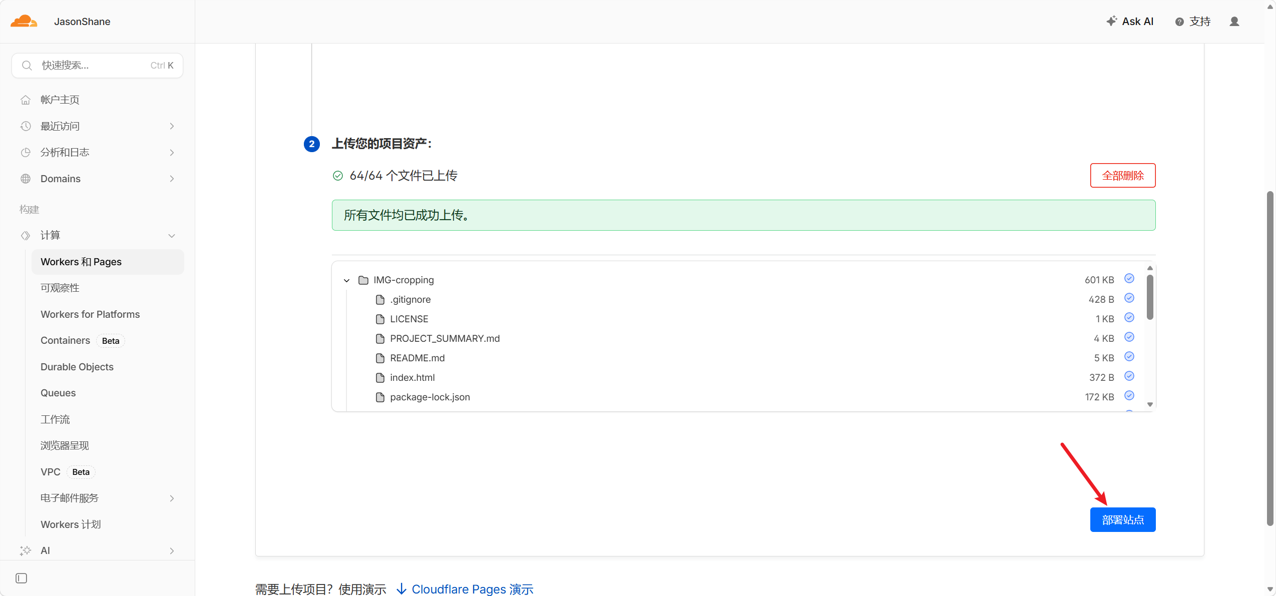 - 等待上传完成之后,点击部署站点