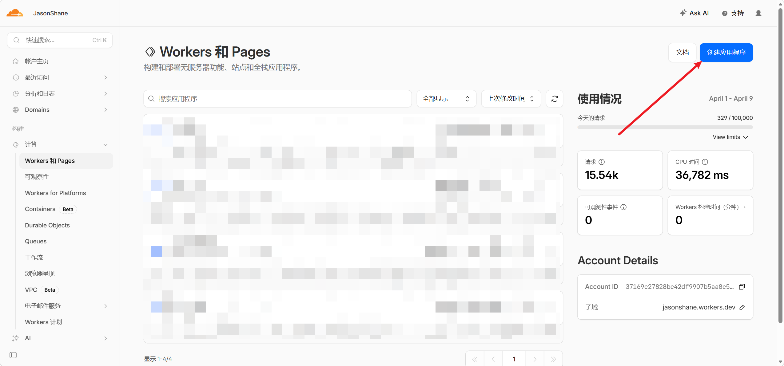 - 点击创建应用程序(注意:我的页面是因为已有项目,全新账号页面可能按钮显示在正中间或其他位置!)