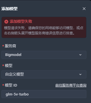 根据经验,这个问题最常见的原因是模型 ID 的填写格式不正确。Bigmodel 的 GLM-5V-Turbo 模型 ID 需要完整填写为 glm-5v-turbo(全部小写),如果你多写了前缀或者大小写不对,就会导致认证失败。