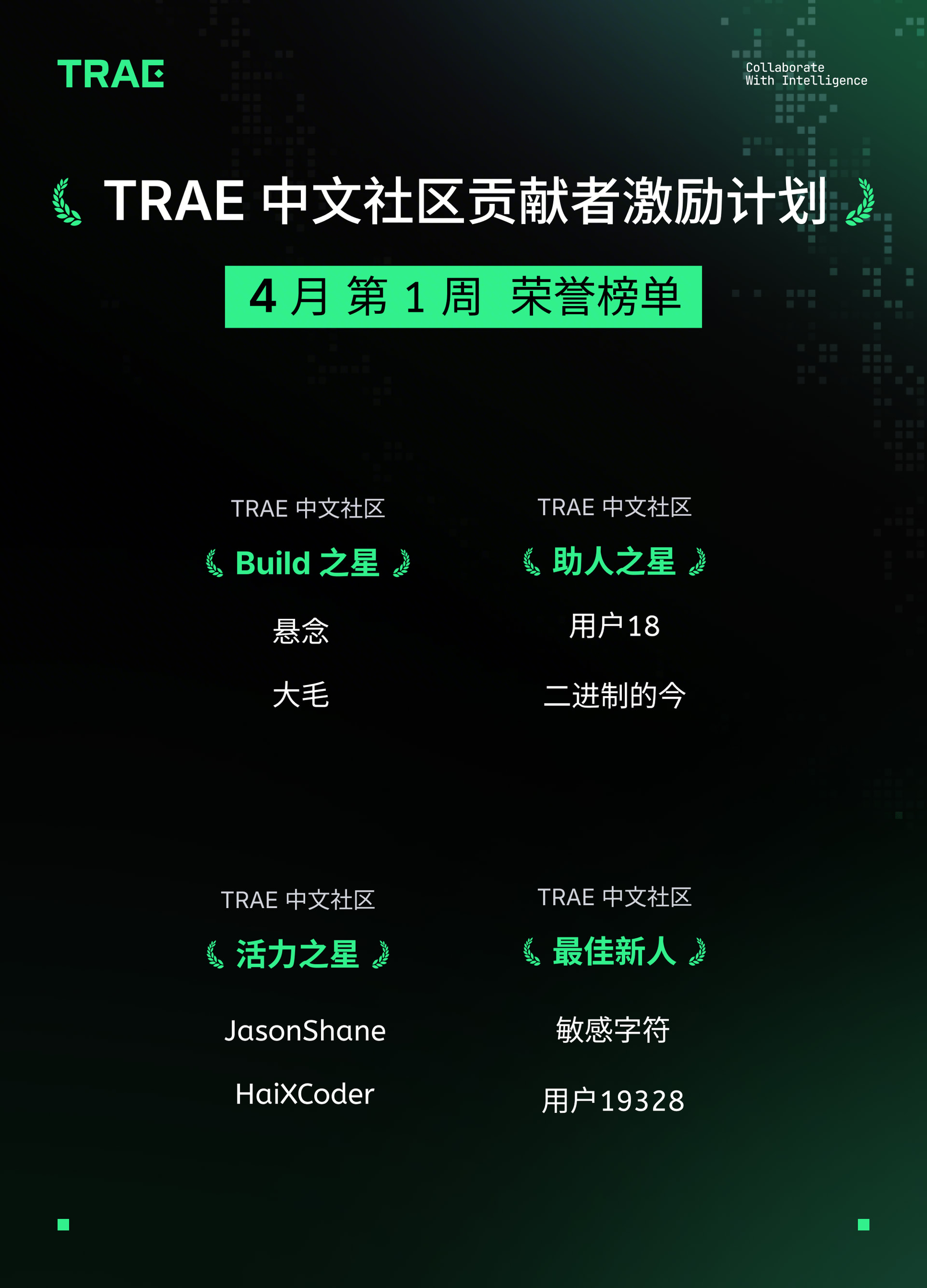 感谢每一位在社区积极分享、互动、帮助他人的 TRAE 友,你们让社区越来越有活力。