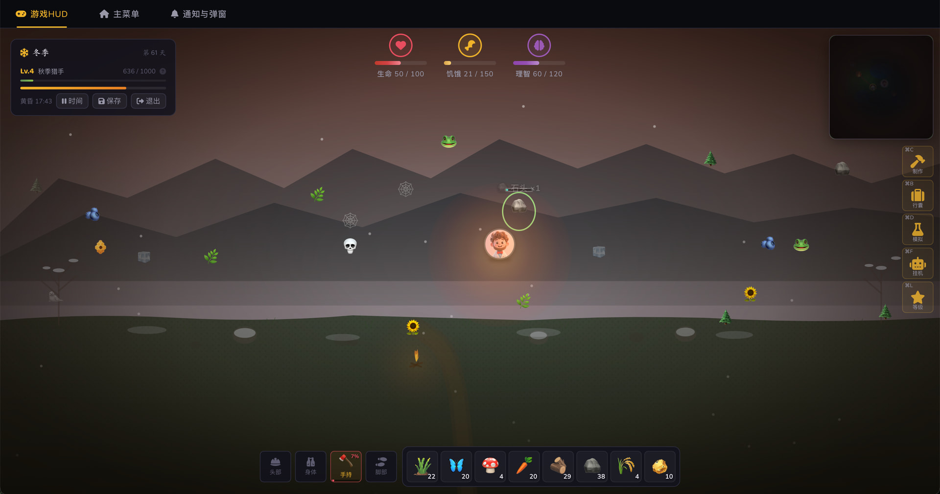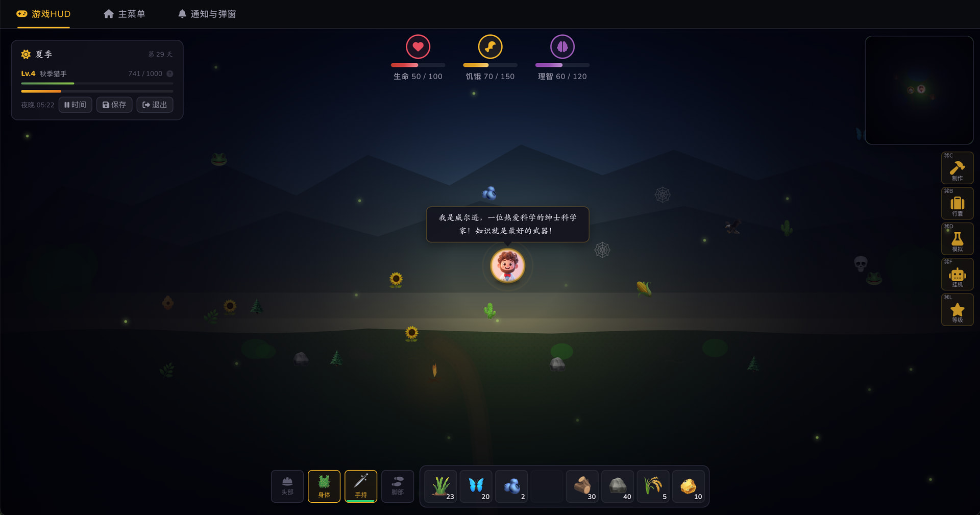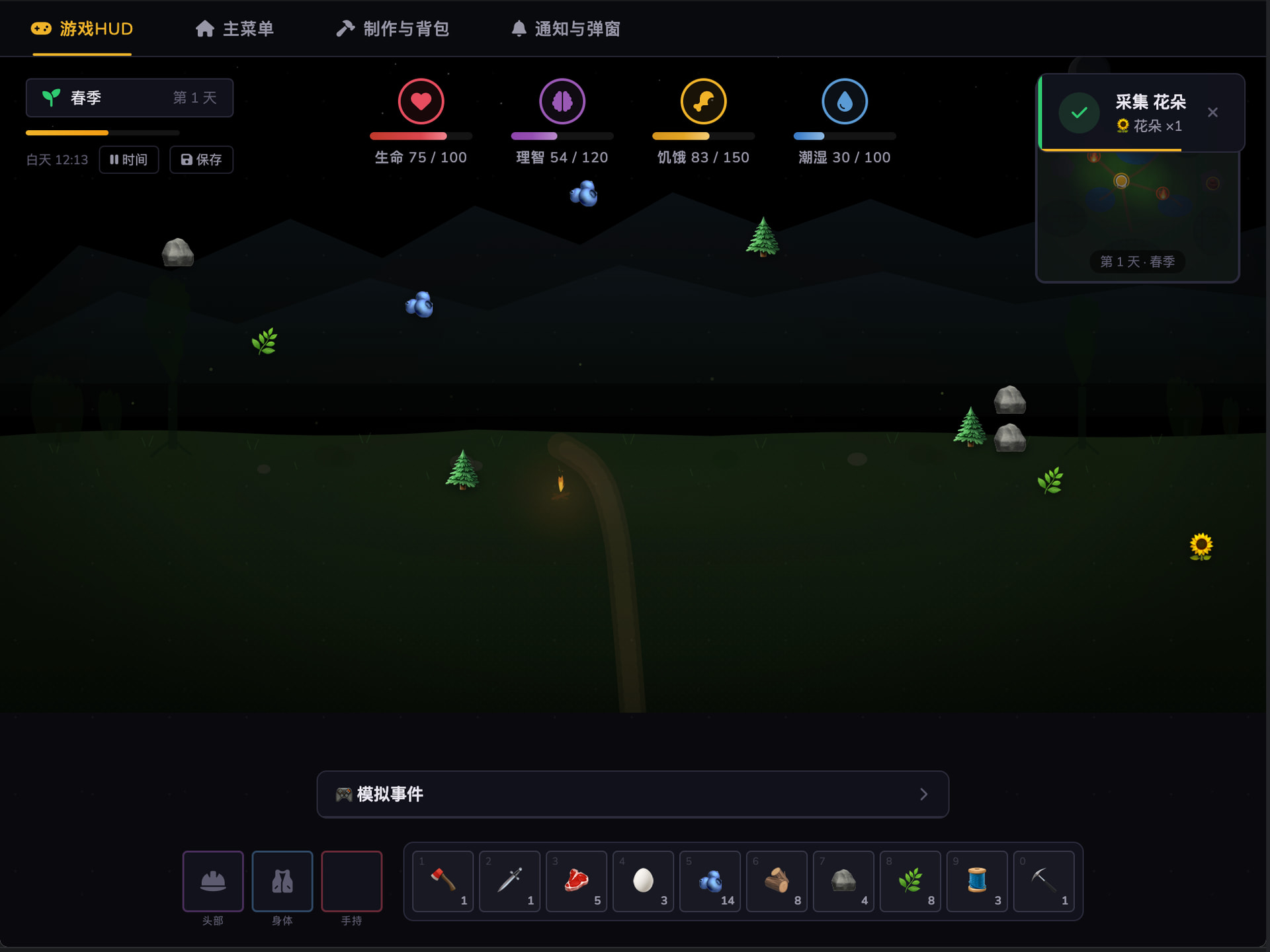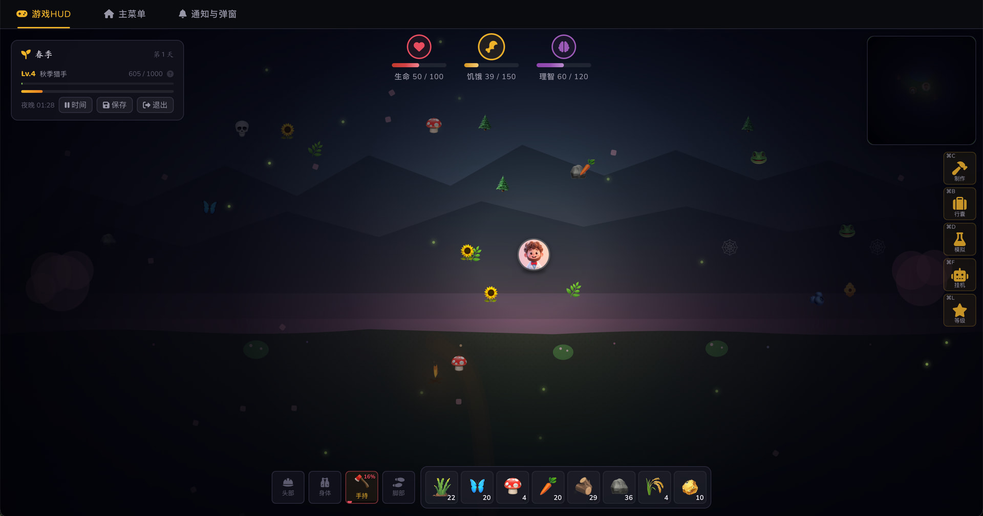 创建一个饥荒风格的网页生存游戏项目,使用 Vue 3 + Pinia + Vite。要求对儿童友好的暗色 UI 风格、角色选择系统(8 个角色)、生存属性系统(生命/饥饿/理智/潮湿)、资源采集和制作系统。