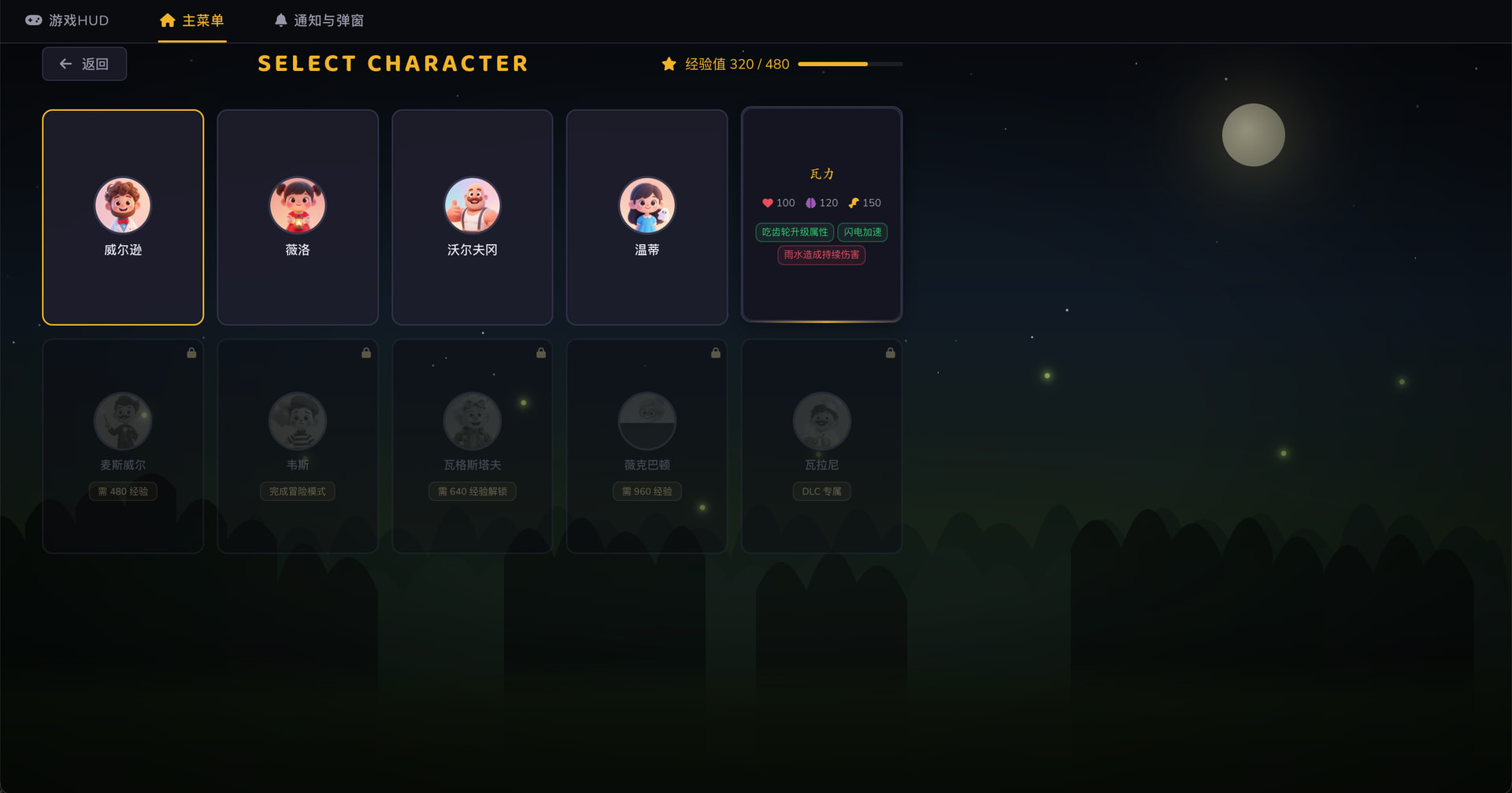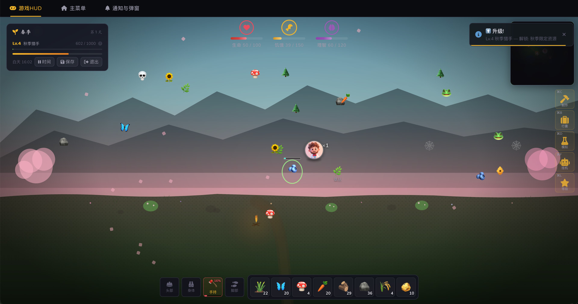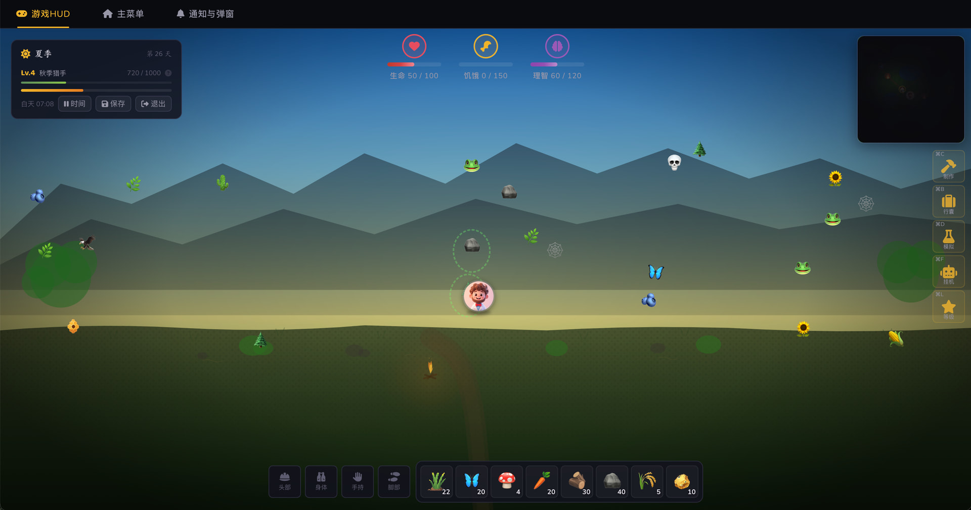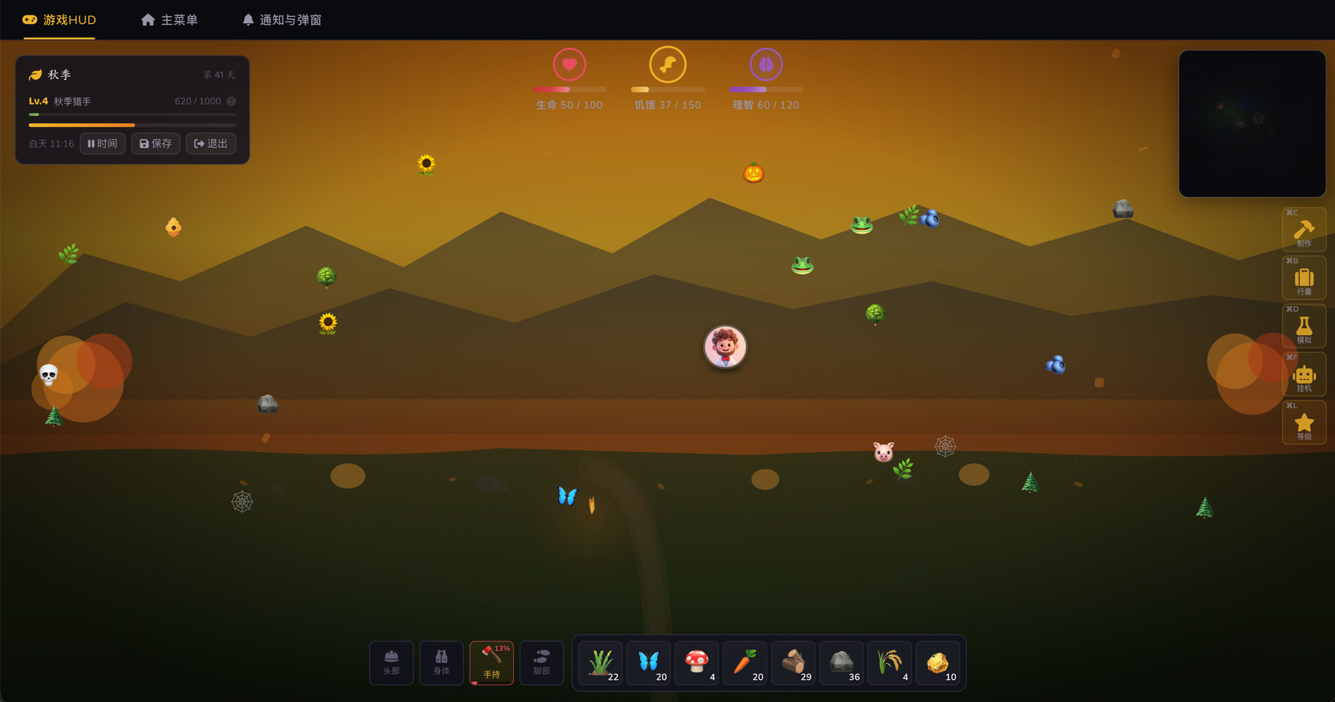 创建一个饥荒风格的网页生存游戏项目,使用 Vue 3 + Pinia + Vite。要求对儿童友好的暗色 UI 风格、角色选择系统(8 个角色)、生存属性系统(生命/饥饿/理智/潮湿)、资源采集和制作系统。
