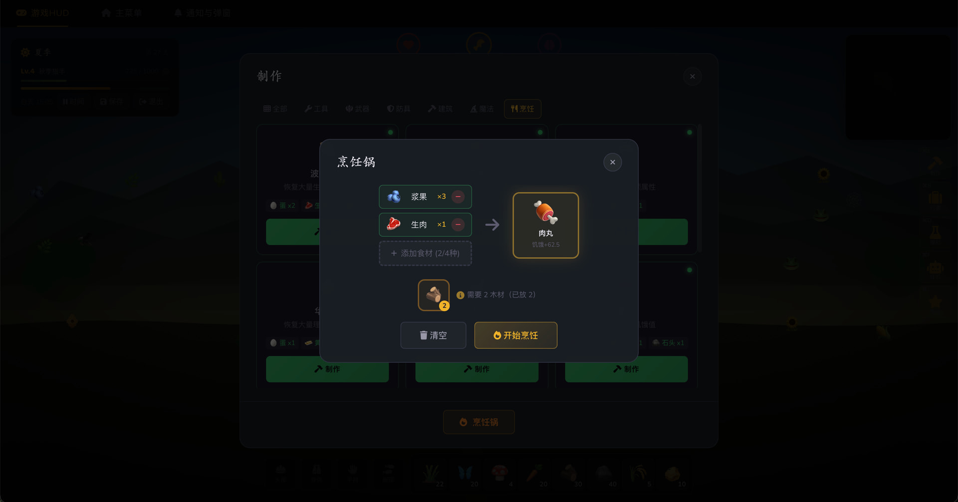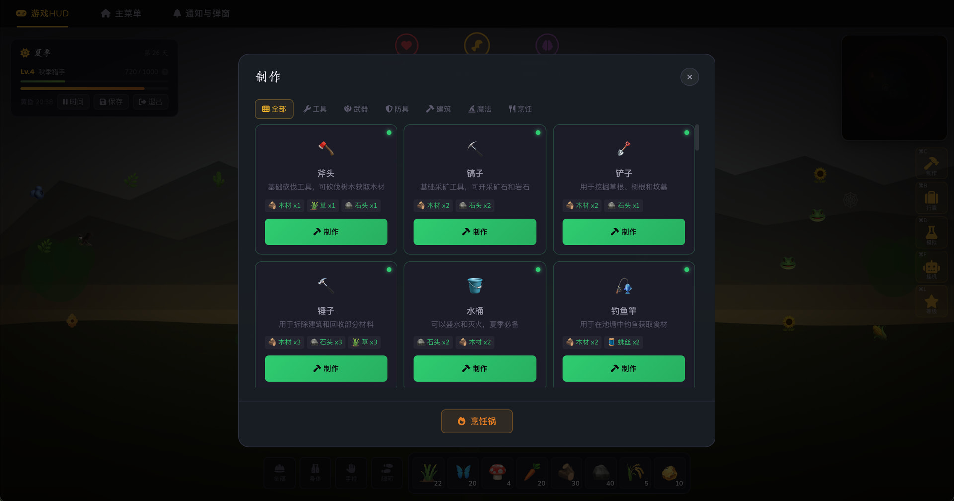 SOLO 还实现了完整的采集流程(点击移动→采集动画→获得物品)和 20+ 制作配方。儿子最喜欢的部分是烹饪锅——把不同的食材丢进去,会做出不同的料理。