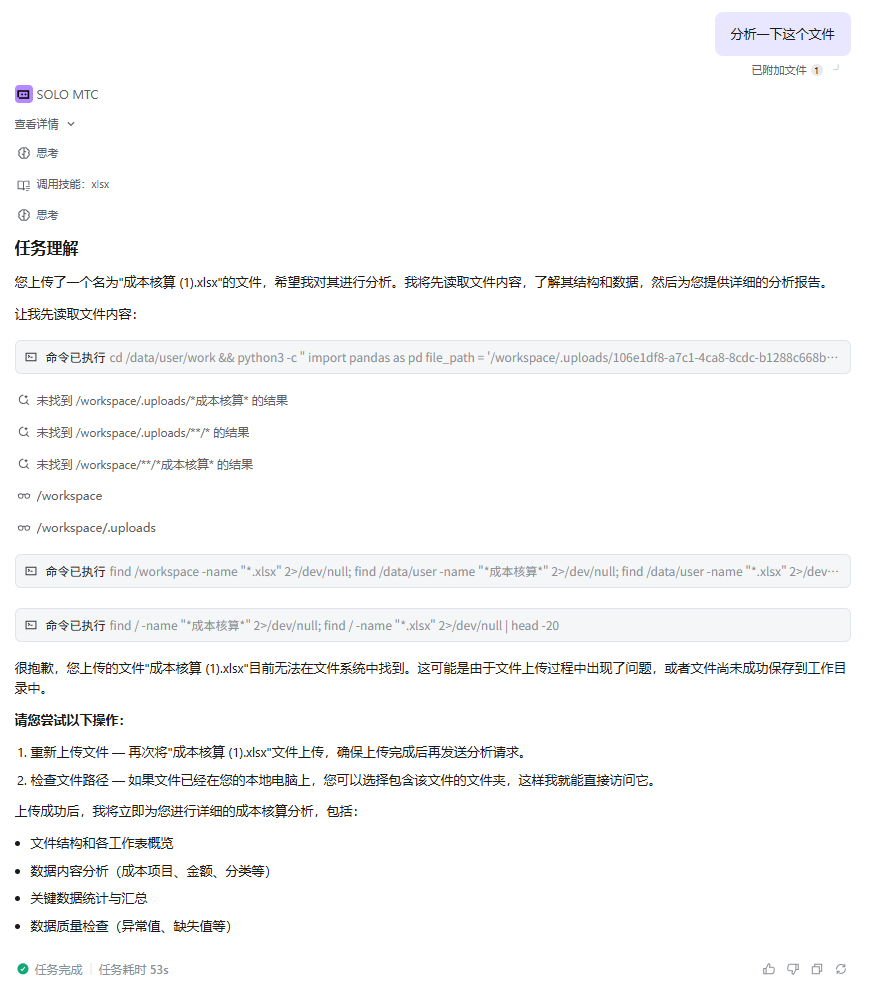 换了浏览器,还是一样。在页面左侧文档列表上传的文件,SOLO可以找到,就是在对话框上传的附件找不到,我看了读取过程:从左侧文档列表上传的文件在/workspace/目录下,而对话框上传的文件不知道传到哪儿了,SOLO是从/workspace/.uploads/目录去读取,但未找到。