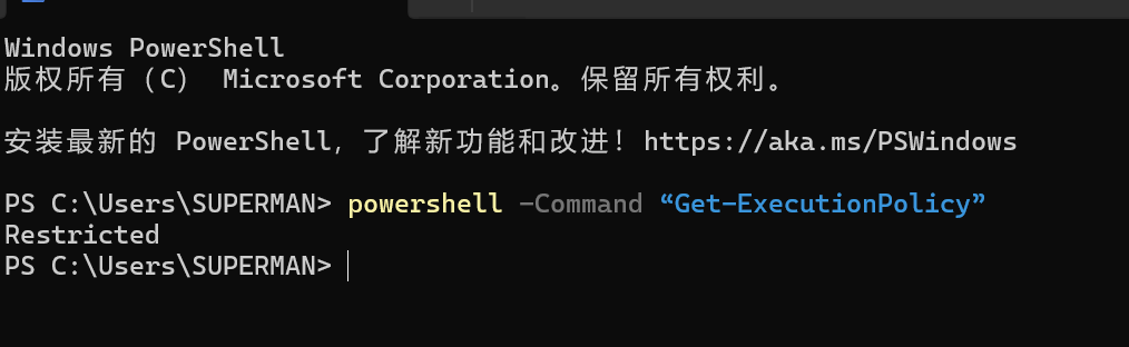 新建一个终端,执行下,看看能不能跑通。powershell -Command “Get-ExecutionPolicy”