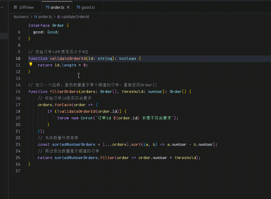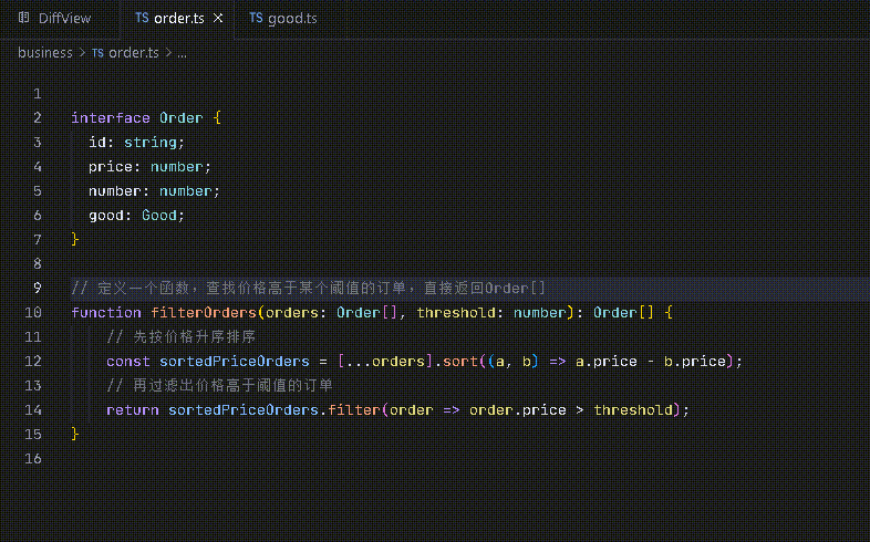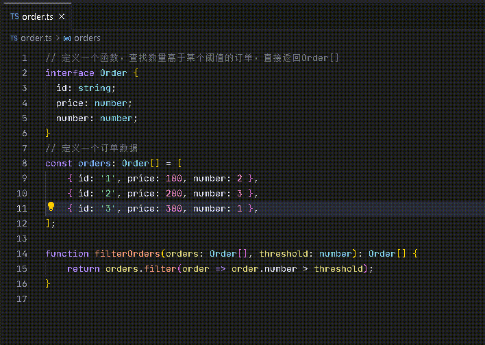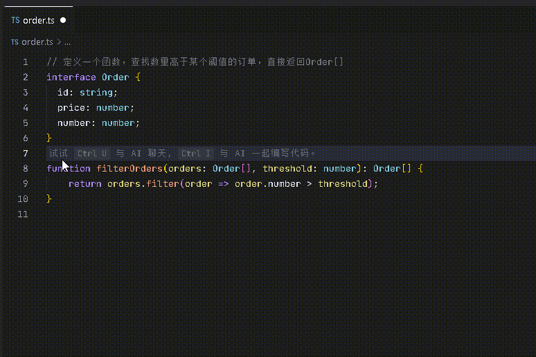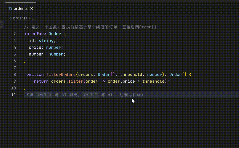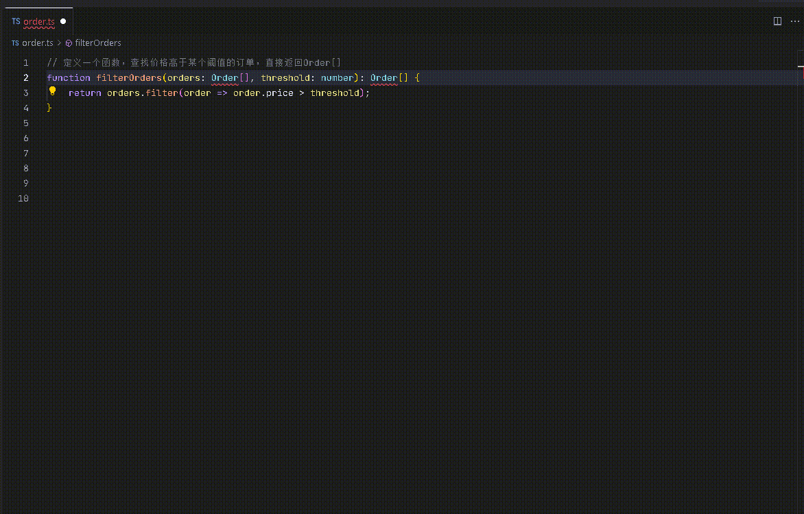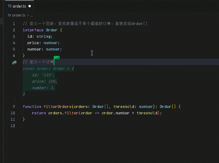 function filterOrders(,CUE会立即以灰色字体生成完整函数定义; -