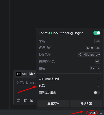 临时开关:点击IDE右下角状态栏的“Tab”按钮,可快速暂停/恢复CUE功能,支持设置5分钟、30分钟等临时暂停时长,避免编码思路被干扰。