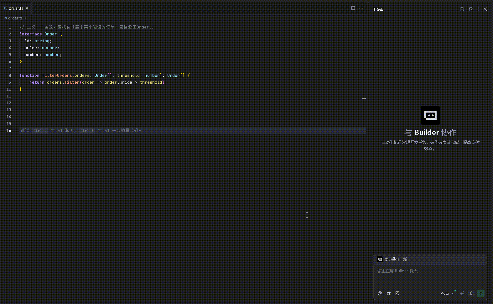 在TRAE的“Builder”面板中先使用自然语言编写开发计划,CUE会基于计划内容优化推荐逻辑: