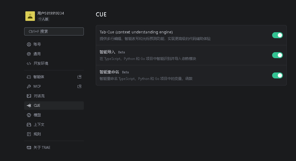 CUE功能默认随TRAE最新版本(V2.0及以上)启用,支持Python、TypeScript、Golang等主流语言,需确保项目已完成代码索引构建(首次打开项目自动生成,大型项目建议等待索引完成后使用)。