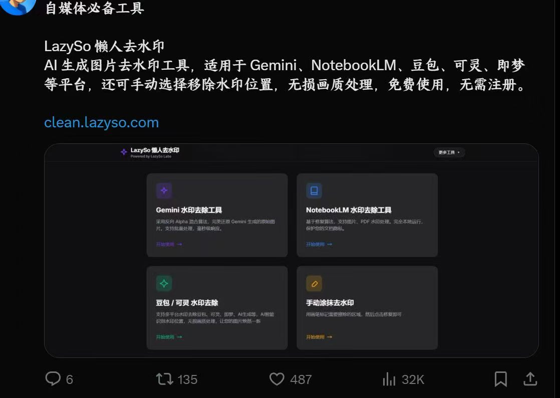 用Trae借鉴了一切纯前端网站,做了一个除AI图片水印的站点:clean.lazyso.com
