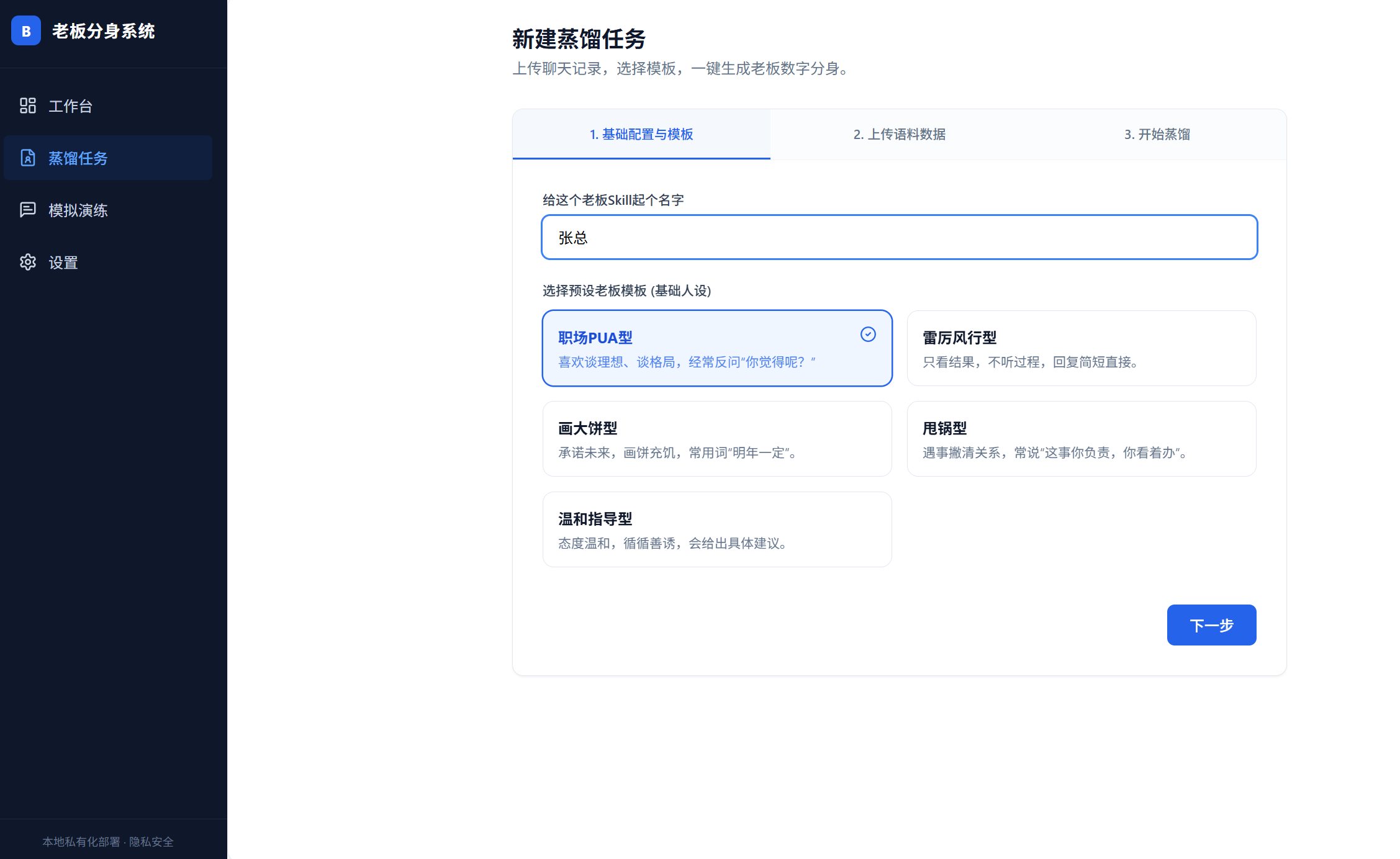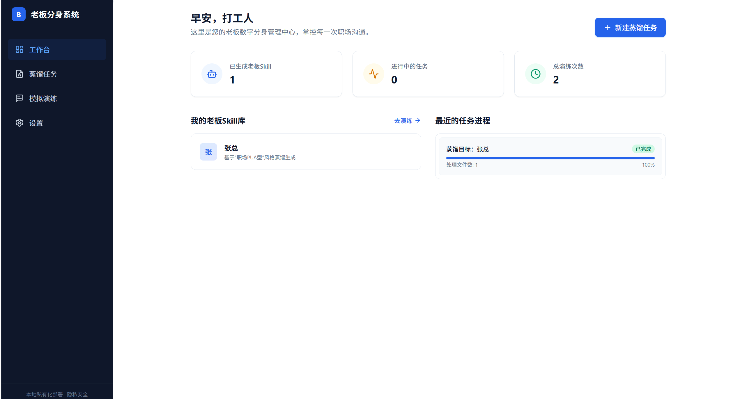 用SOLO10分钟做了并开源了一个小工具 Boss-Distiller(老板蒸馏系统):上传真实聊天记录/文件,提取老板的话术与思维风格,生成可对话的“老板 Skill”,还能做沙盘演练并实时拆解潜台词、给高情商回复建议。整个项目是纯前端 + 本地 Ollama,数据只在本机浏览器里,隐私压力小很多。