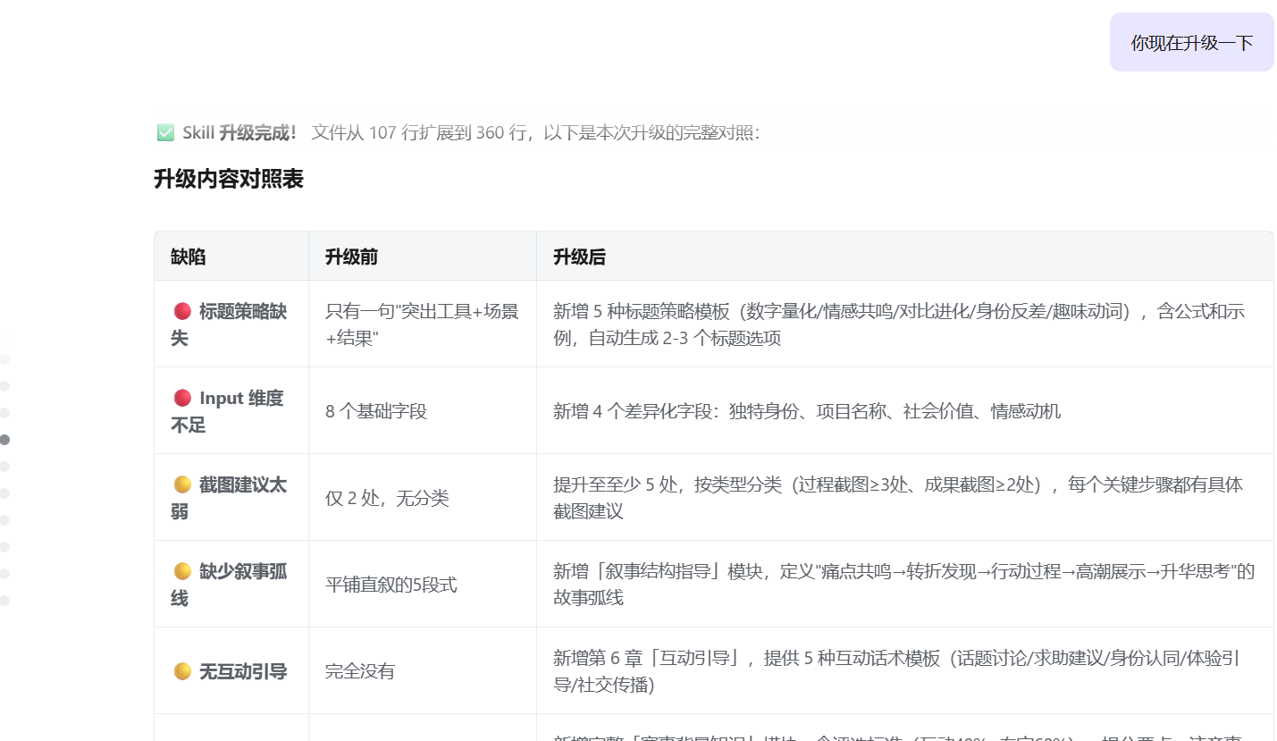 逐一修复后,Skill 从 107 行扩展到 360 行,新增了标题生成策略、叙事结构指导、互动引导模块、赛事背景知识等完整体系。