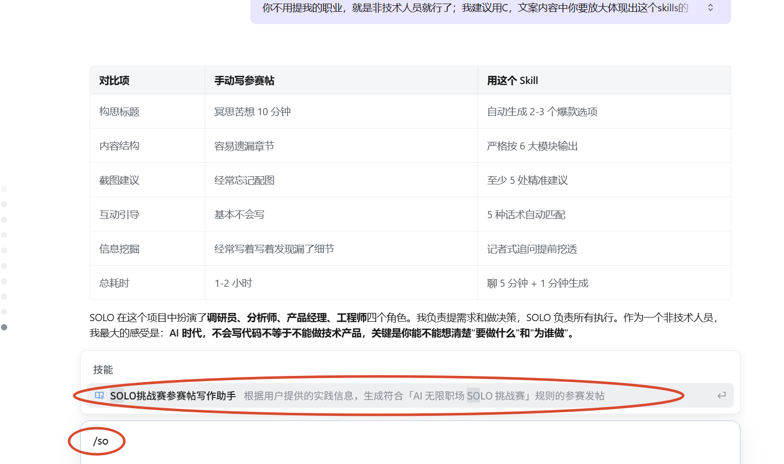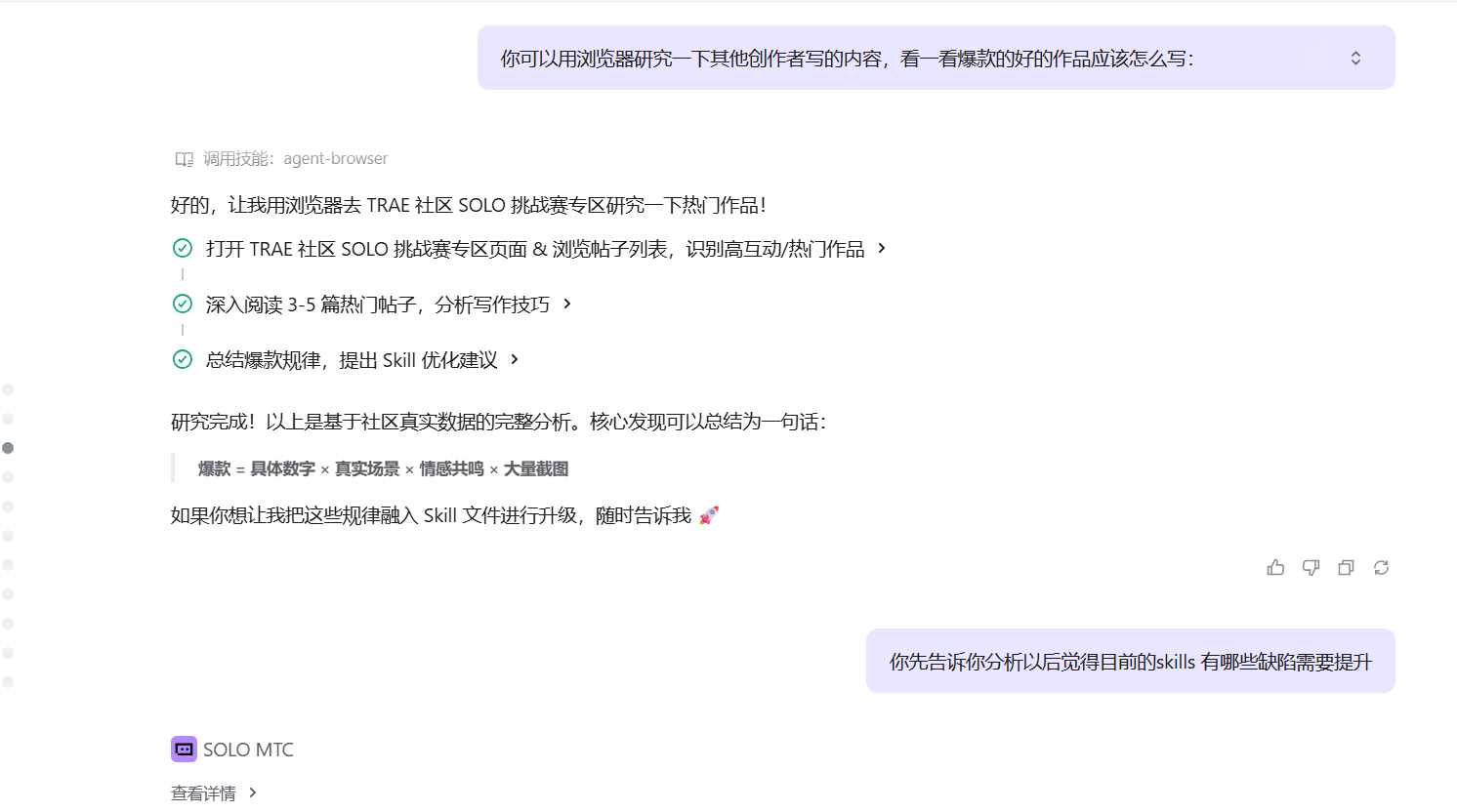 最后说句掏心窝子的话:这个 Skill 从调研到上线,每一步都是 SOLO 帮我完成的。而你现在正在读的这篇帖子,也是它按照我们确认的方向生成的。