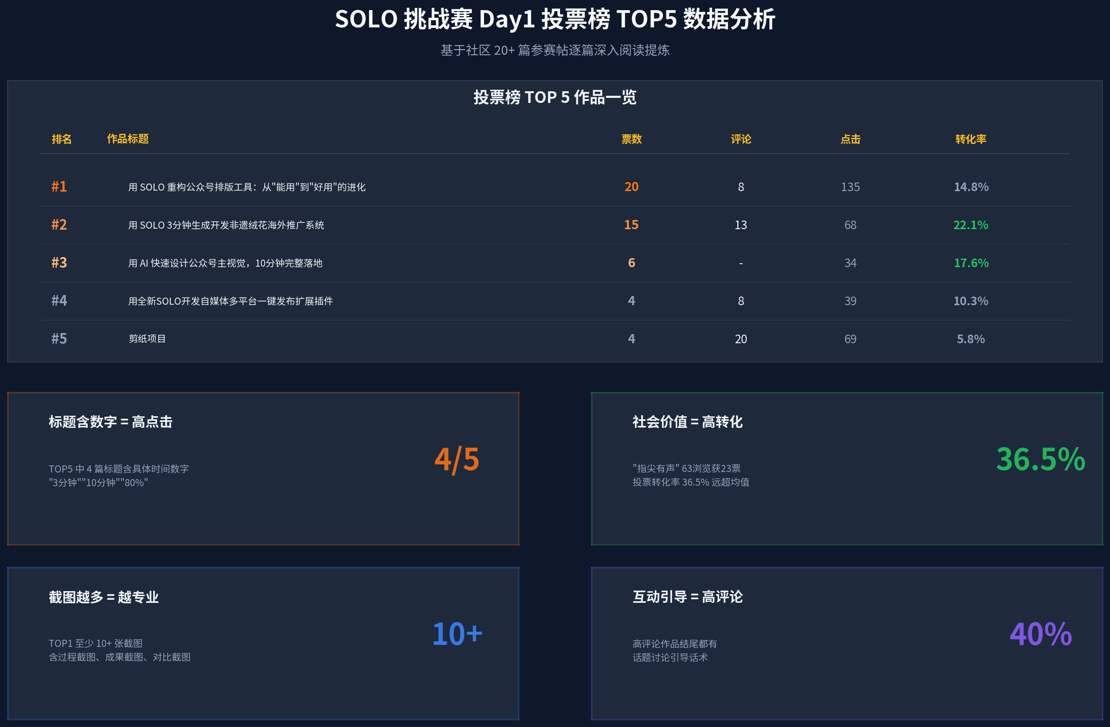 然后逐篇深入阅读投票榜 TOP 5 的作品,分析它们的标题写法、内容结构、截图数量。SOLO 帮我从 20+ 篇帖子中提炼出了几条硬核规律:
