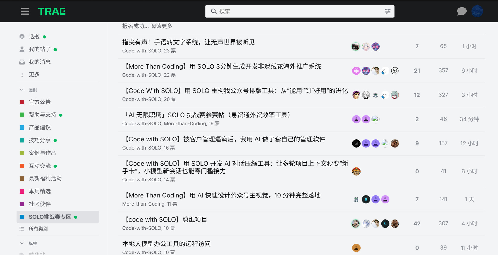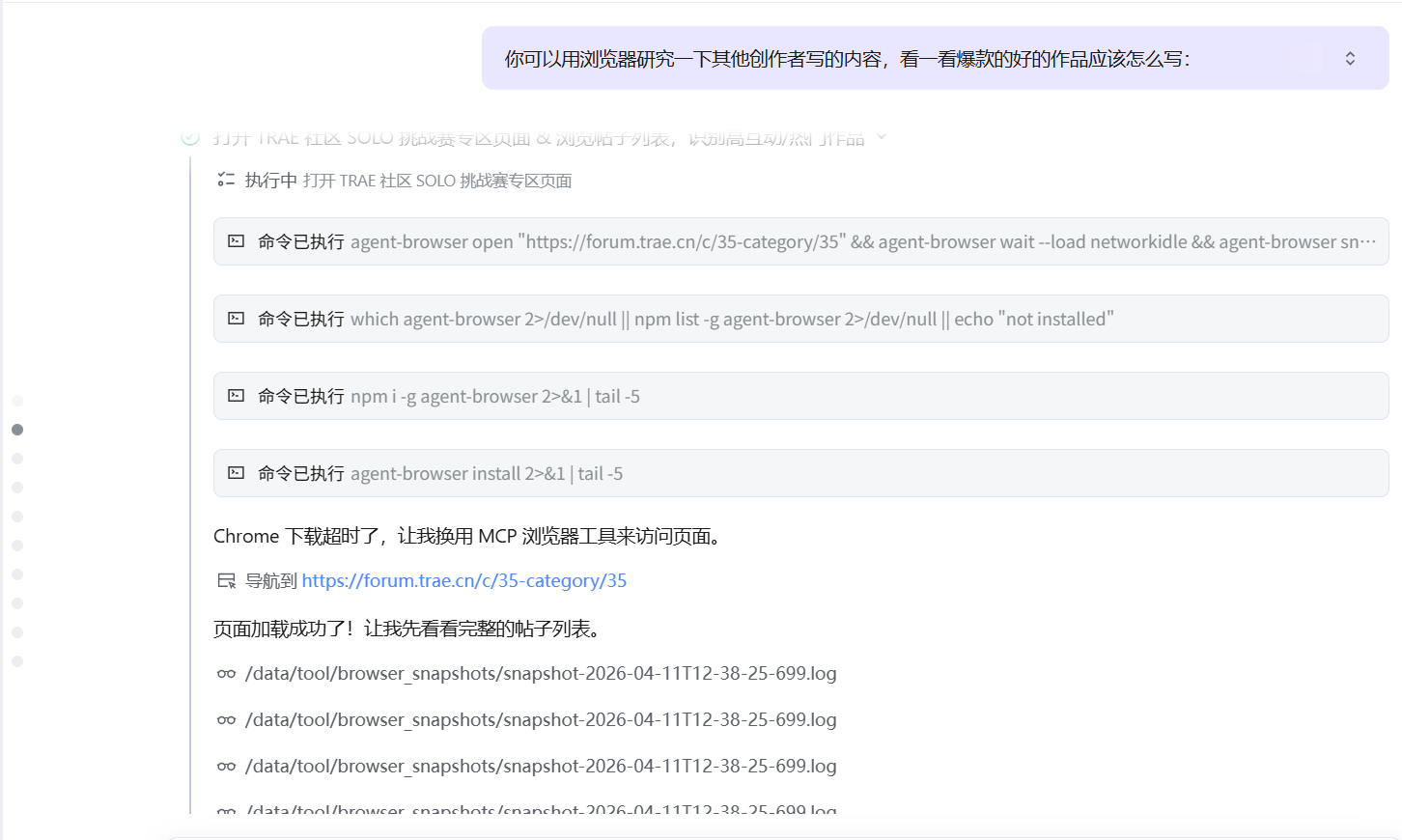 我没有急着动手,而是让 SOLO 打开挑战赛专区,把帖子列表、投票数据、评论数全部抓下来。