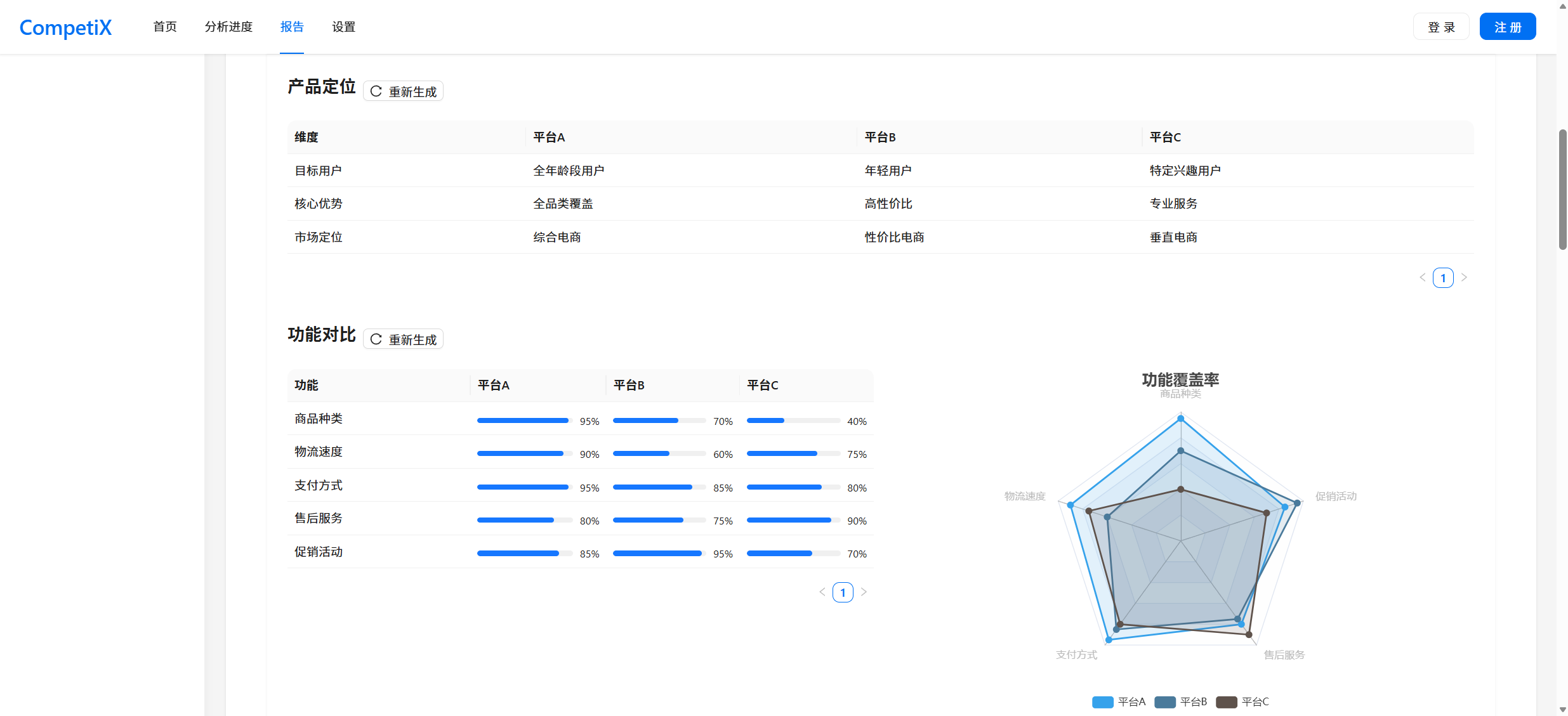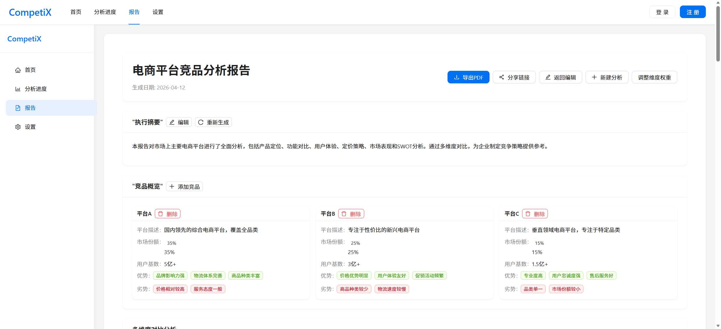 多维报告:自动生成涵盖定位、功能、体验、定价、市场、SWOT六个维度的详细分析。