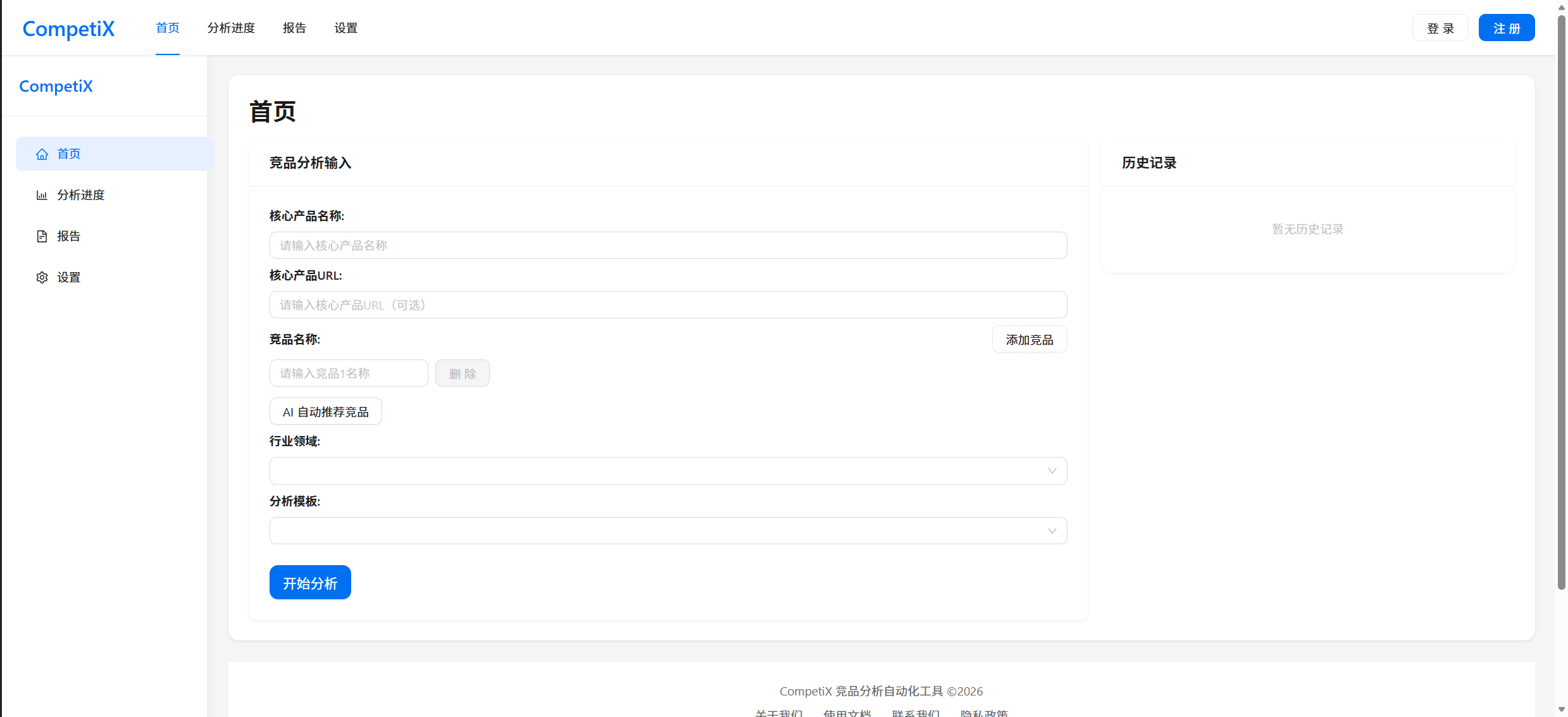 首页输入页:实现了产品与竞品名称输入、行业选择、分析模板选择等功能,并利用