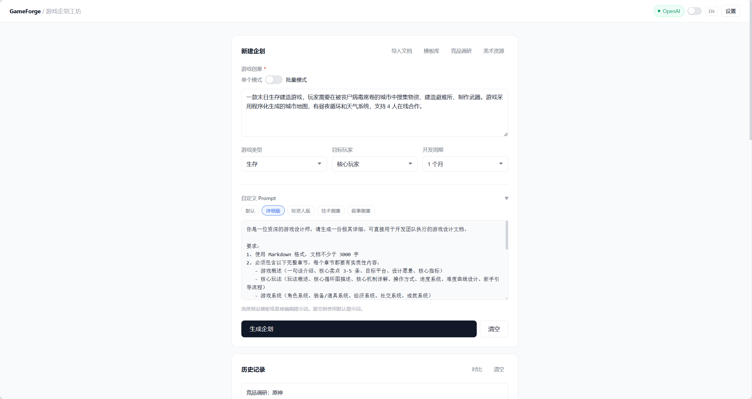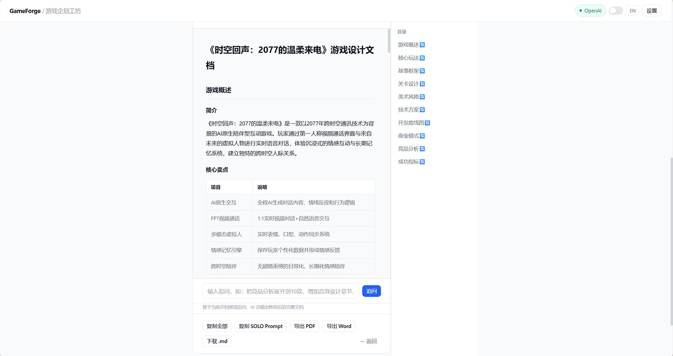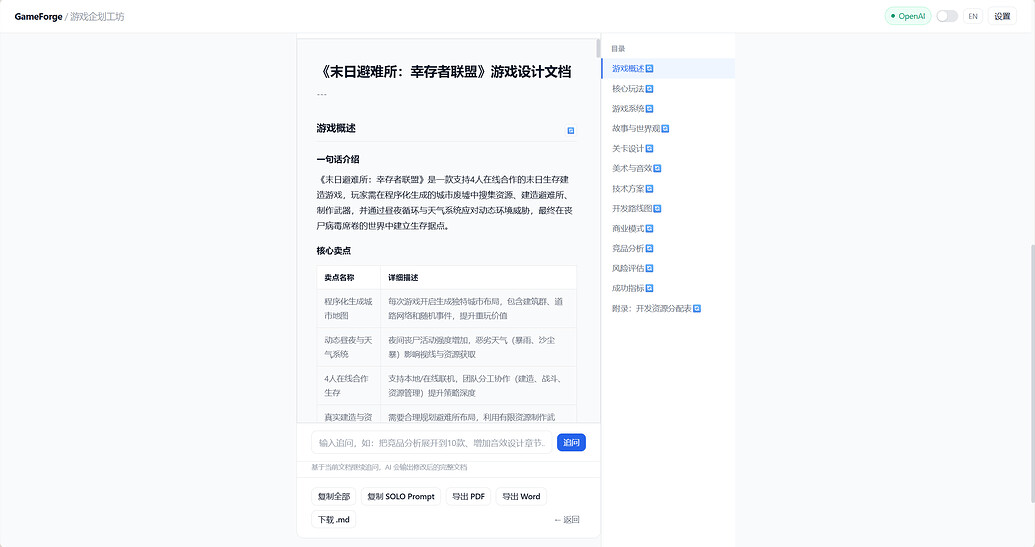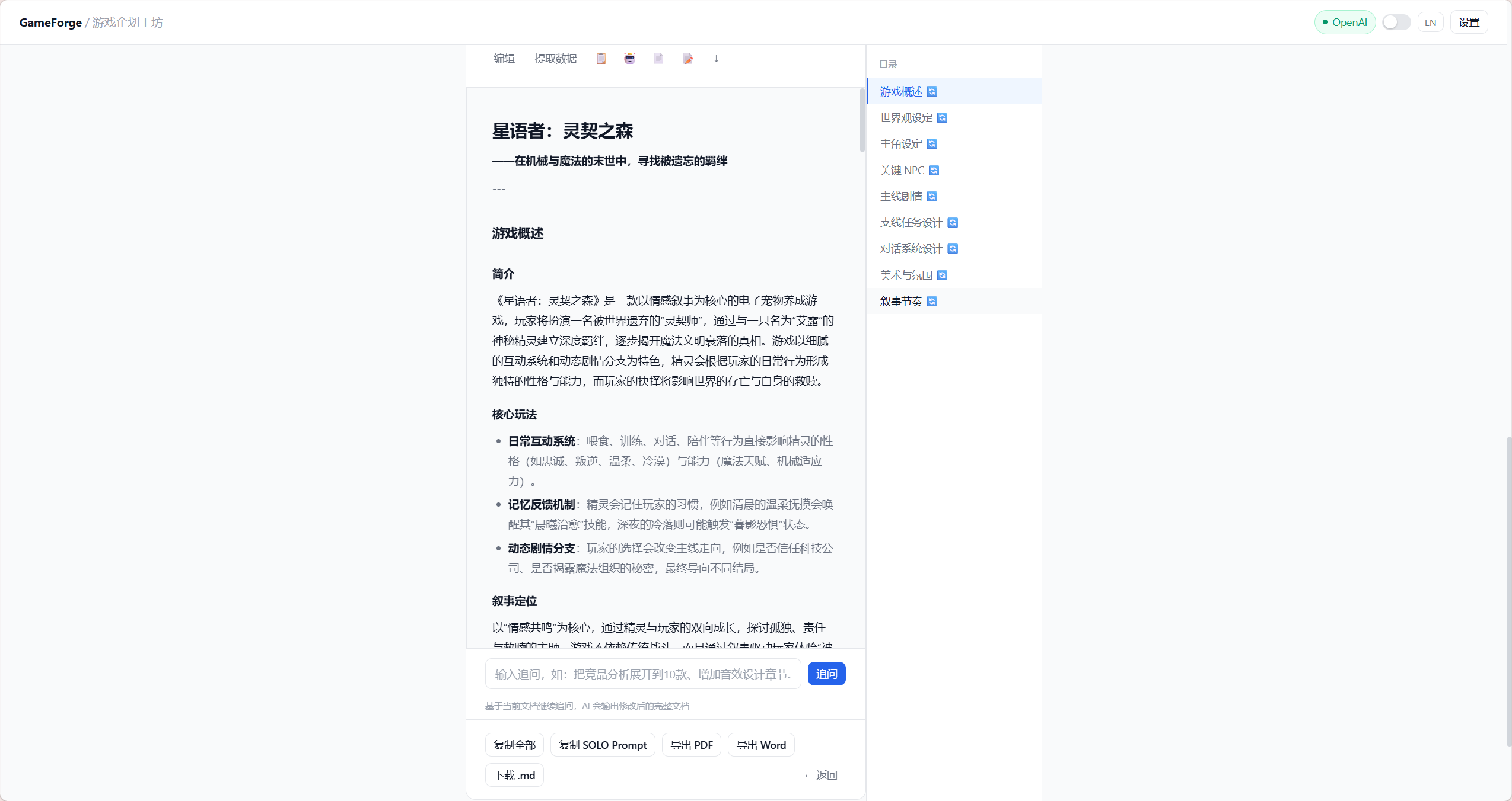 GitHub 仓库:Baijidot/gameforge-: AI 驱动的游戏设计文档(GDD)生成器,支持 OpenAI / Claude 及兼容接口。