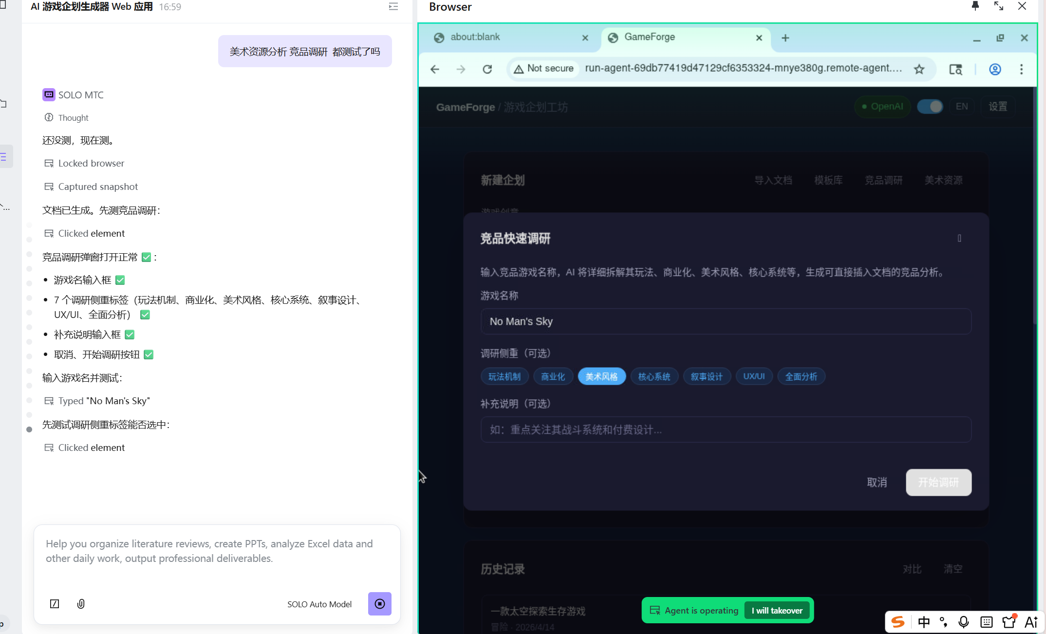 我用 TRAE SOLO 搭建了「游戏企划生成器」GameForge,用户输入游戏创意,系统自动生成完整游戏设计文档、技术方案、代码框架,可一键跳转到 SOLO 生成可运行游戏 Demo,把原本 1–2 周的流程压缩到 1–2 小时,效率提升 50–100 倍。