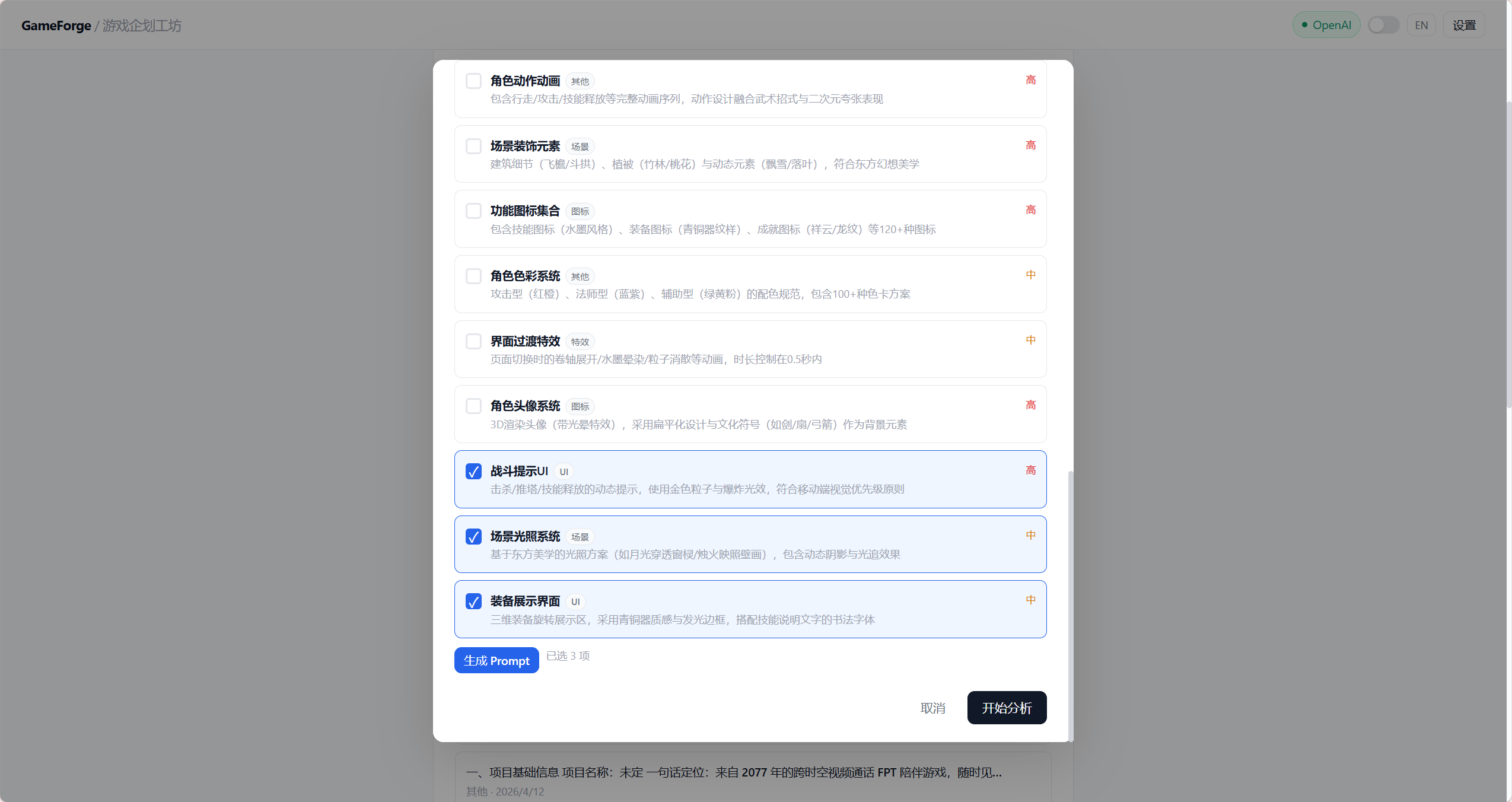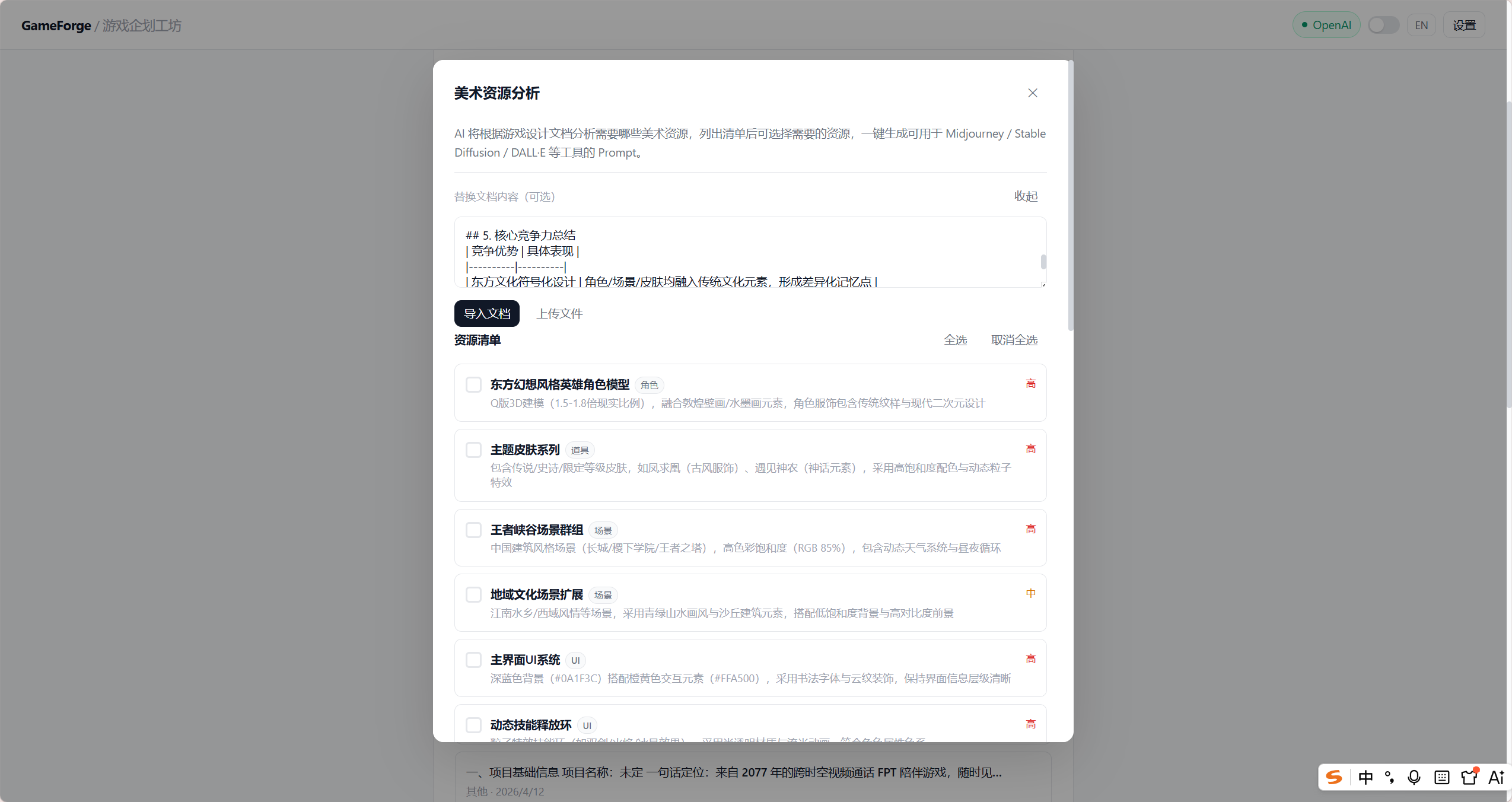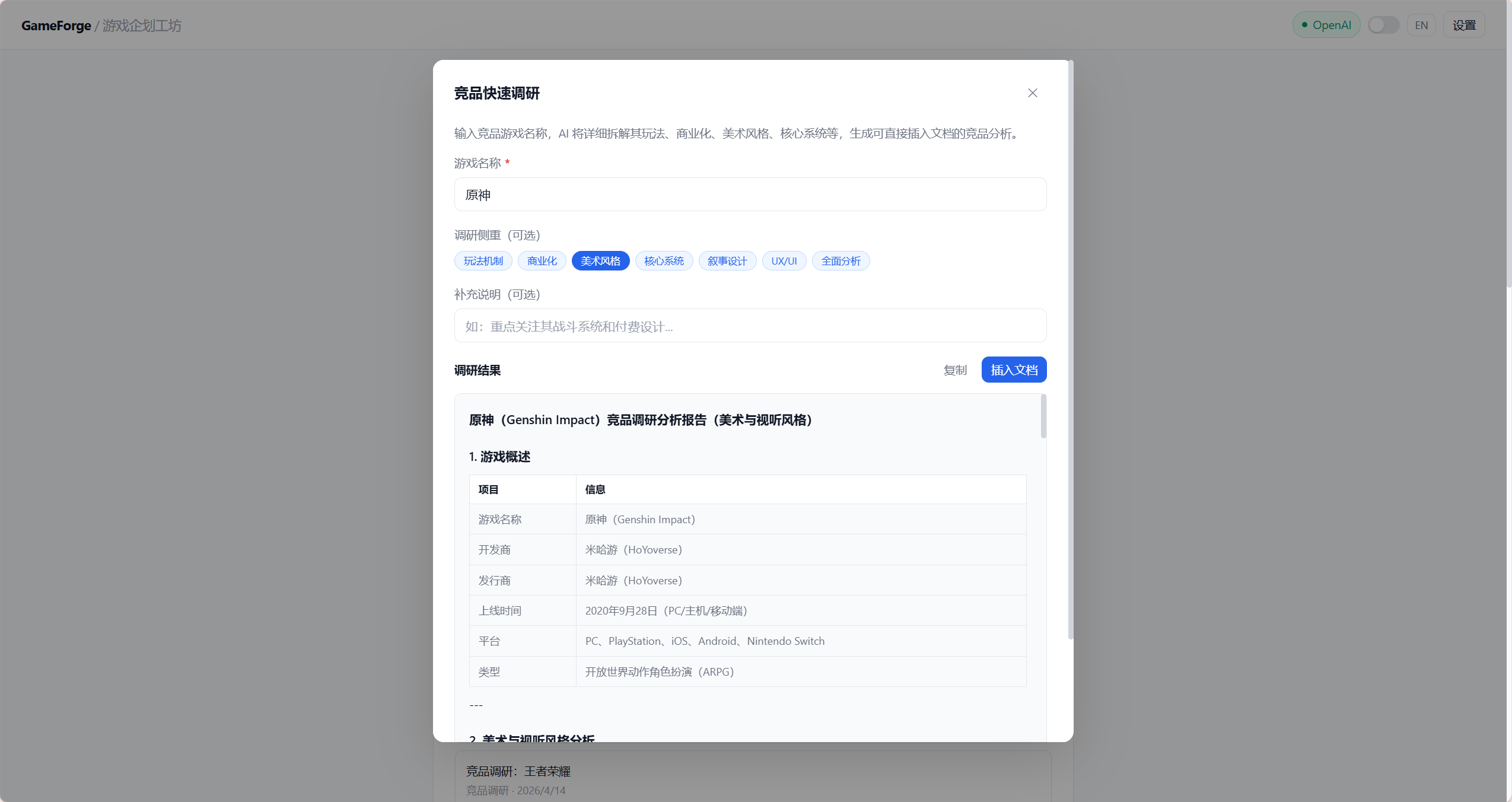 输入竞品名称,自动生成:核心玩法、商业化、美术风格、核心系统,可一键插入 GDD。