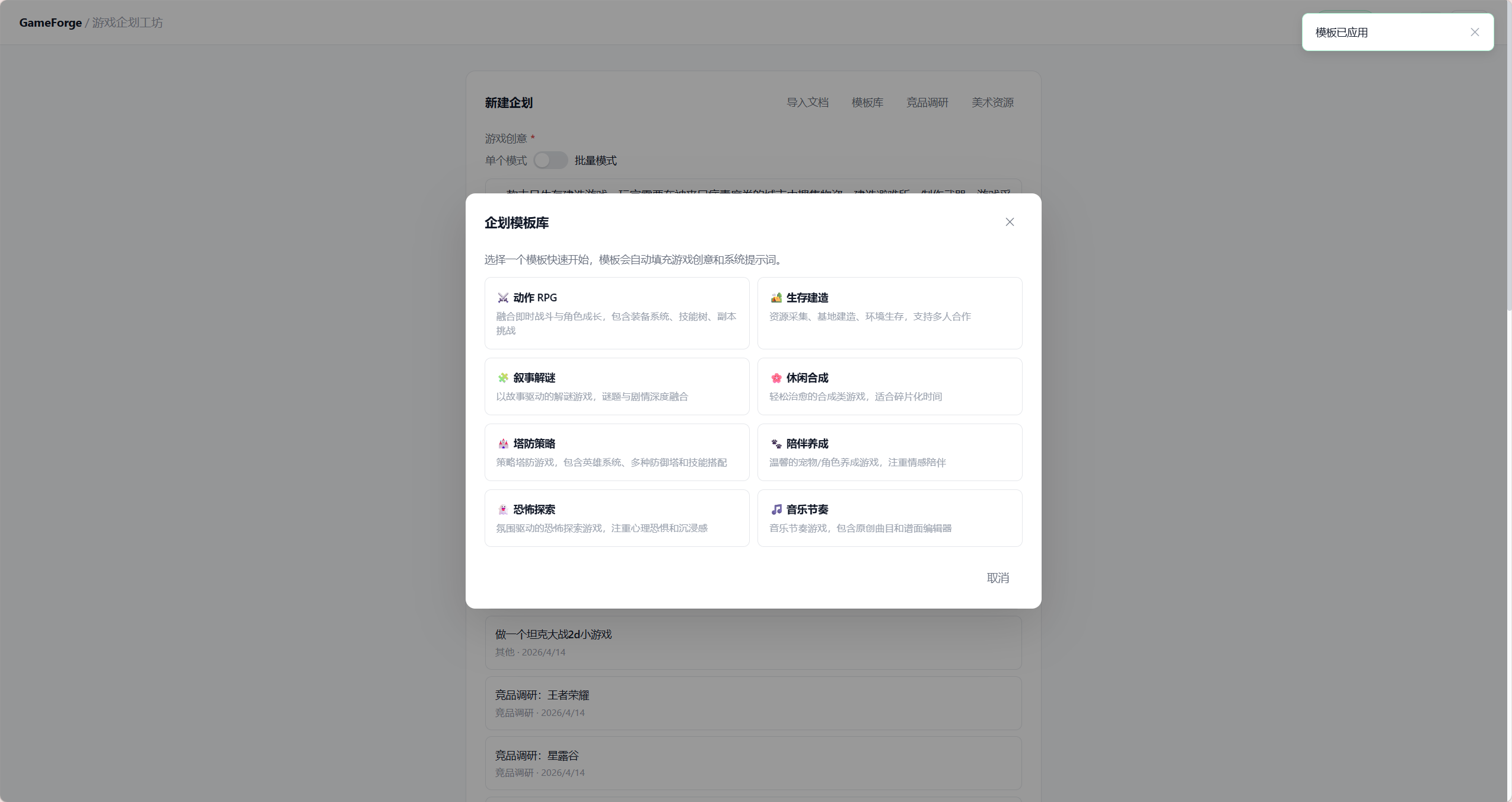 我是游戏策划兼 AI 产品经理。独立游戏开发普遍存在一个痛点:有创意,但从「想法」到「开工编程」门槛极高。