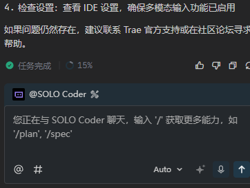 trae solo模式在auto下突然没法上传图片了,只有关闭auto模式,选择相关包含图文识别的才可以上传,但是在之前用的时候都可以在auto模式下直接上传图片
