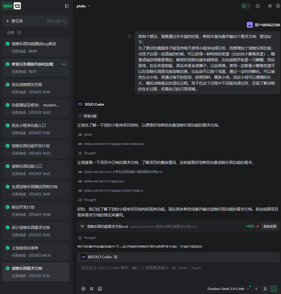 1、需求:通过提出一个大致想法,让SOLO输出需求文档,然后通过对需要文档的多轮不断完善,最终确定需求版本。