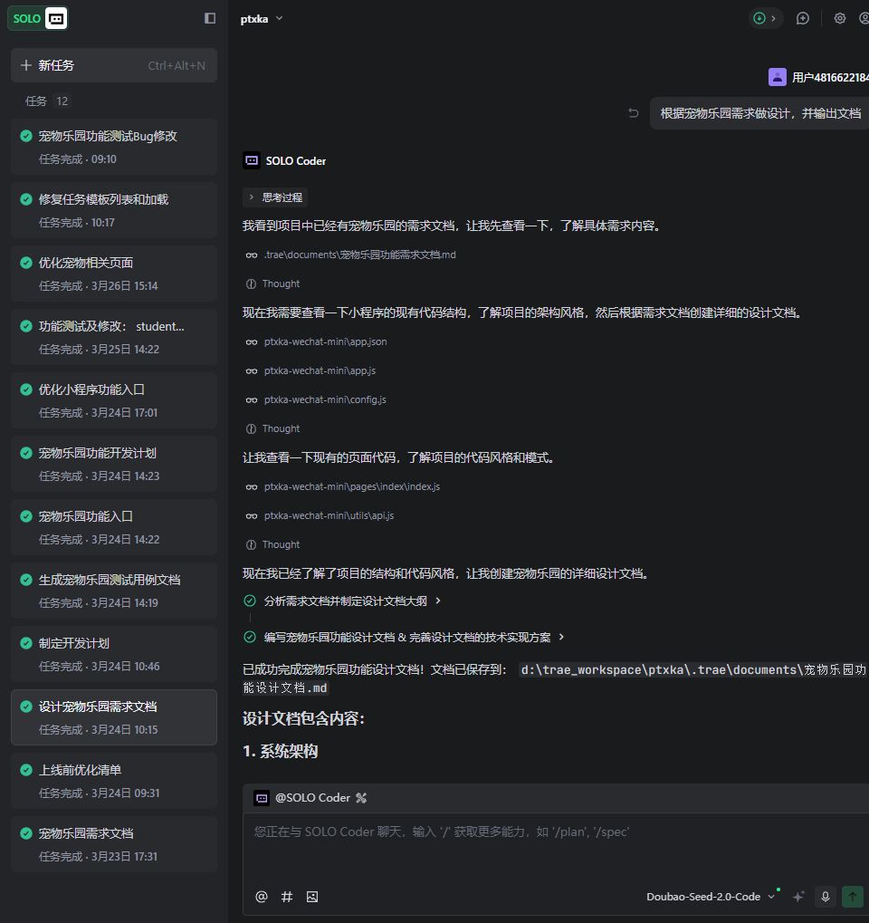 2、设计:让SOLO根据需求输出设计文档,同样通过多轮不断优化完善,最终确定设计文档。