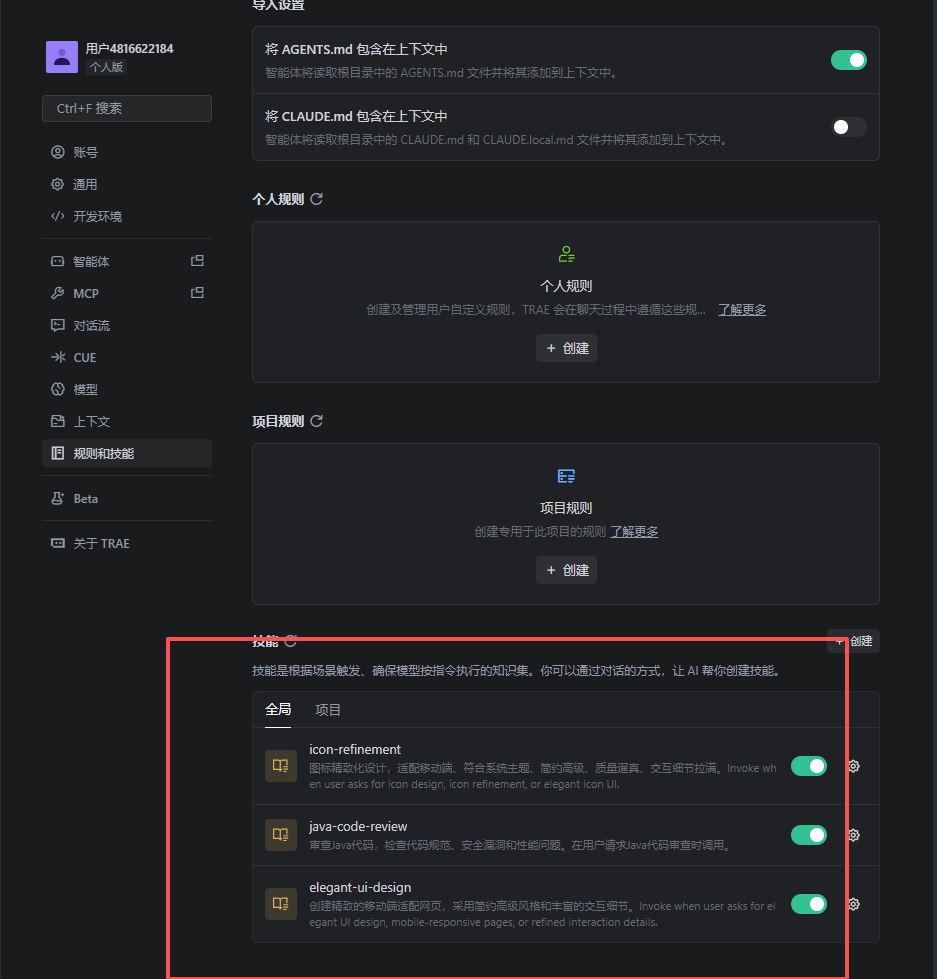 首先第一步是准备工作,自己需要对整个项目的技术体系有个大概的范围,比如说:前端用什么技术体系、后端服务使用什么语言开发,这样就可以先给SOLO增加以下技能,让SOLO输出的结果更符合自己的要求: