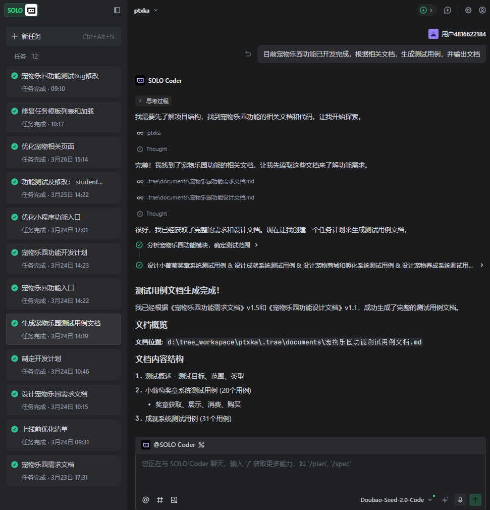 5、如果想要测试用例,还可以让SOLO根据设计输出测试用例文档