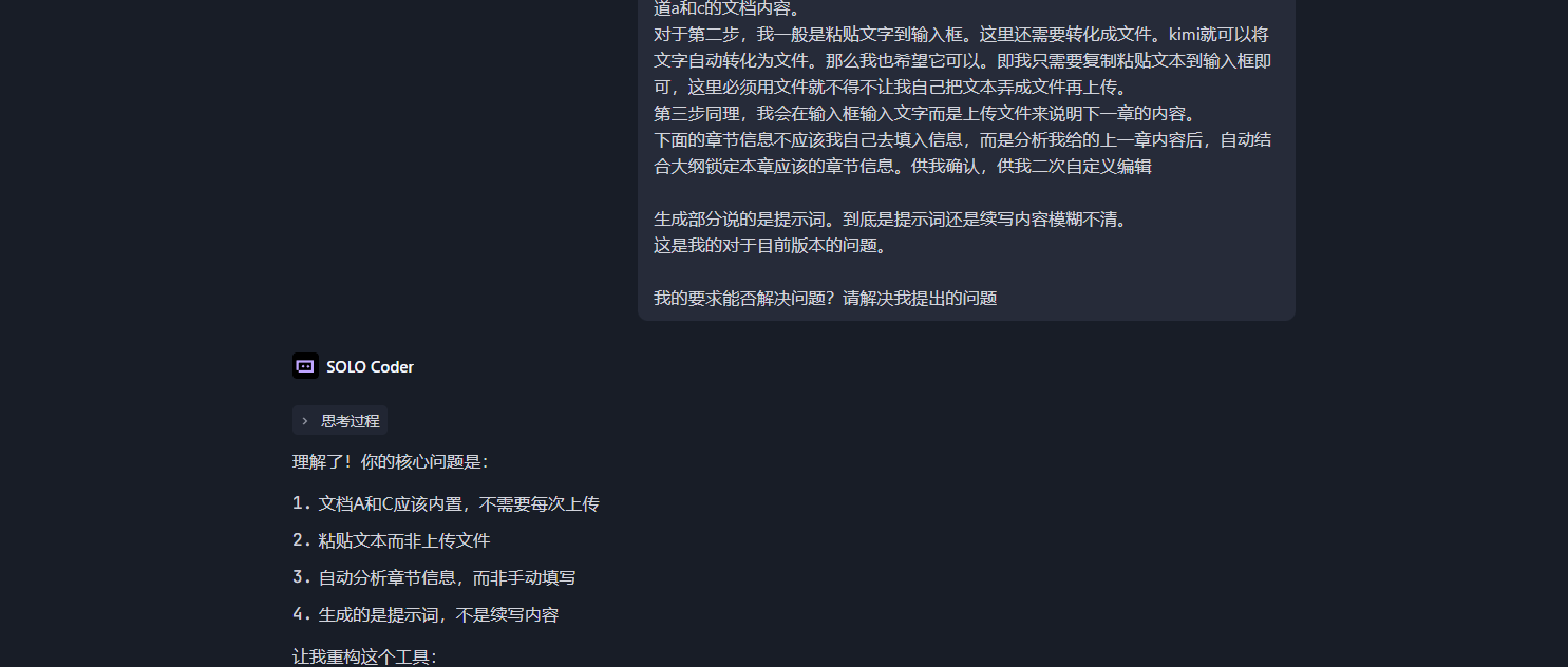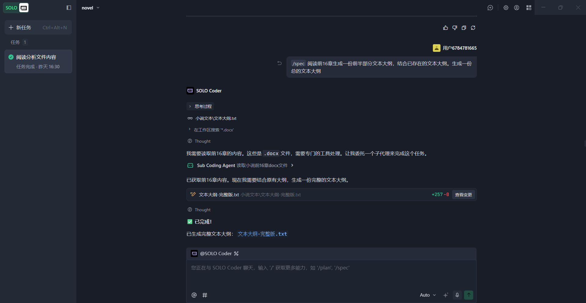 我要强调的是我的十六章内容加上后半部分的文本大纲总共超过十五万字。Solo能够吃下的同时还能生成一份不错的总的文本大纲。换成其他的对话型ai,比如kimi,我喂到九万字左右就要求新对话了。