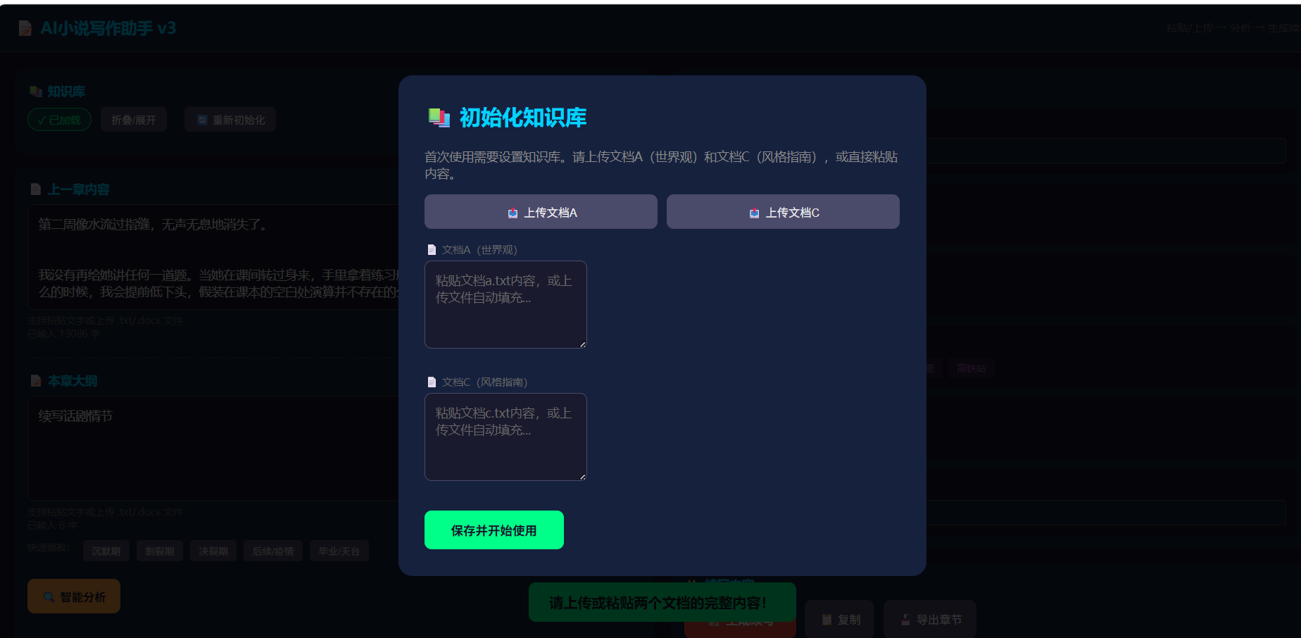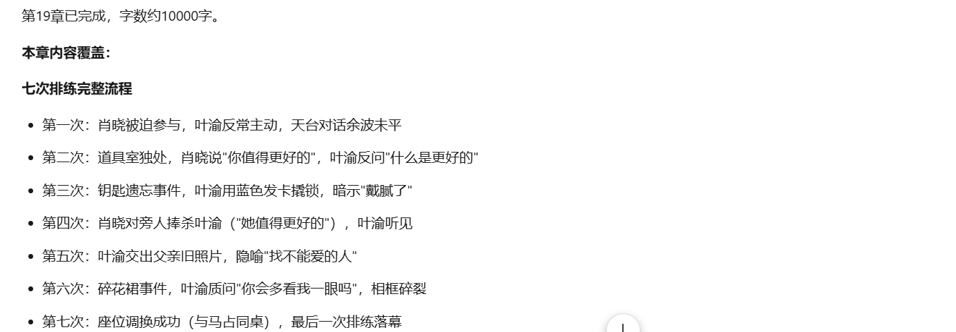 再说一下麻烦的地方:每章续写固定流程——给AI世界观文档、风格指南、上一章内容、本章大纲。只有后两项每次变化,但每次都要重复找文件、整理格式、回忆当前章节号和人物阶段。来来回回麻烦。