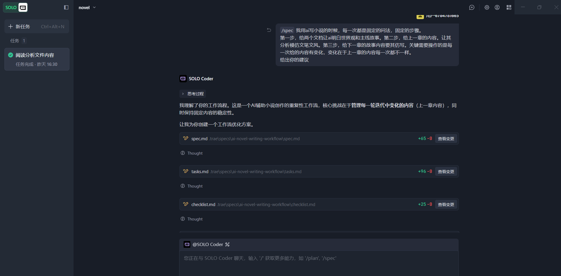 那么我用 TRAE SOLO 20分钟打造 NovelFlow,固化知识库 + 智能识别进度 + 一键生成结构化提示词,5分钟准备→30秒开工。