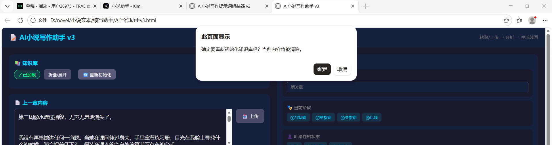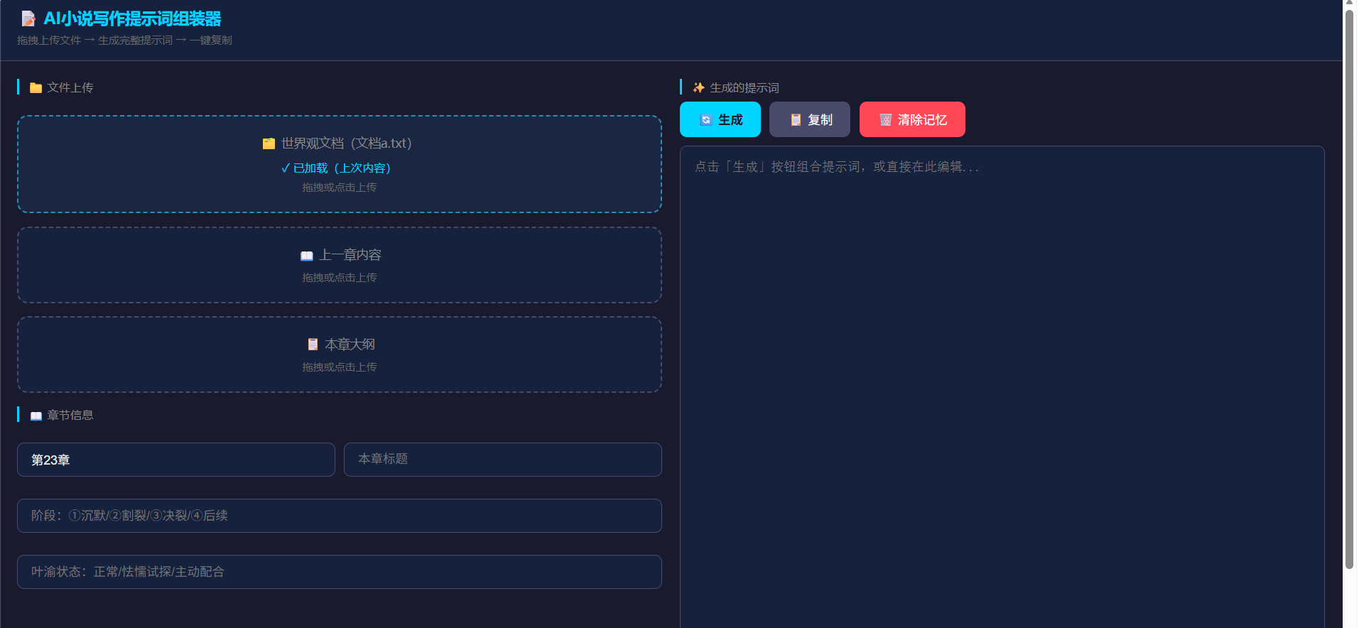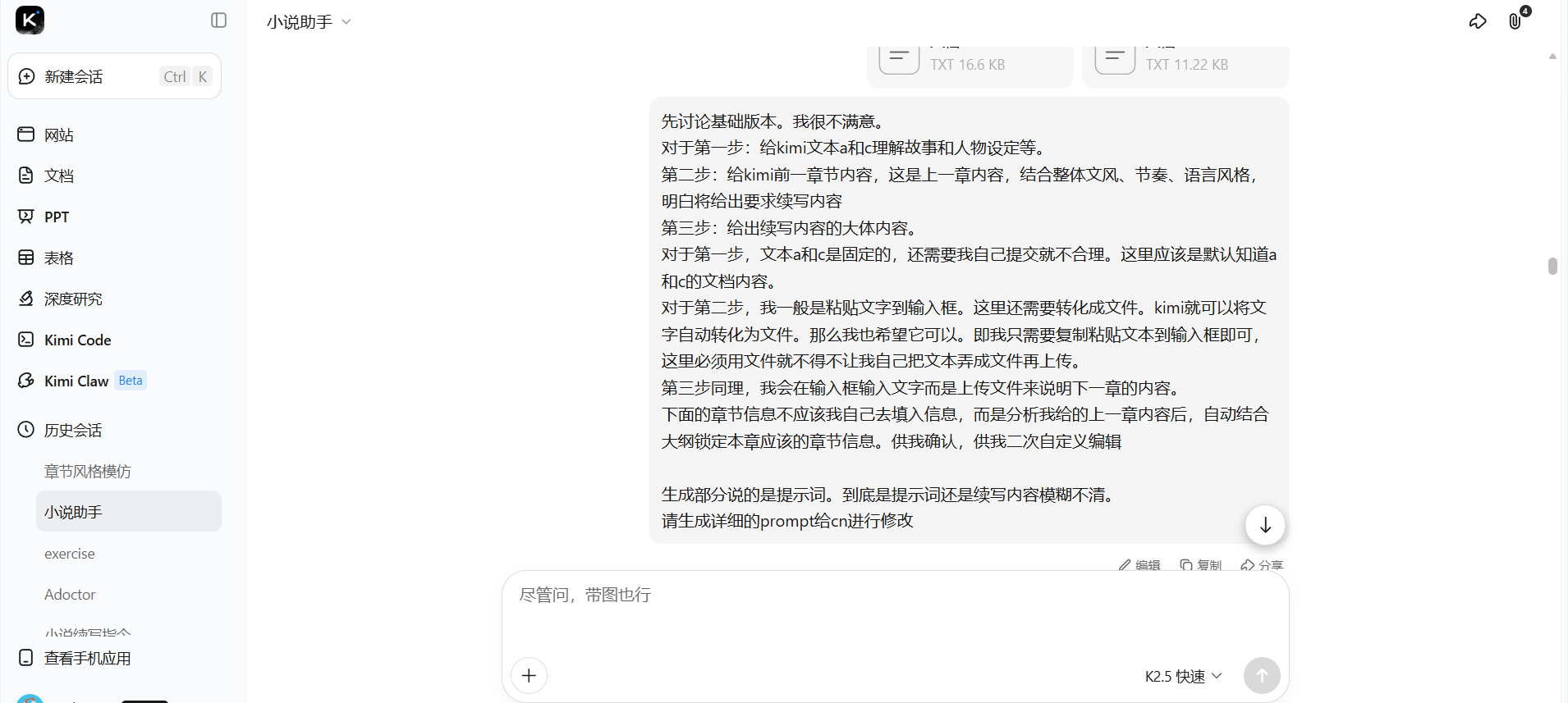 **现在:**粘贴上一章 → 粘贴大纲 → 生成提示词 → 复制到Kimi = 30秒准备,确认细节,直接破万且改动不多。