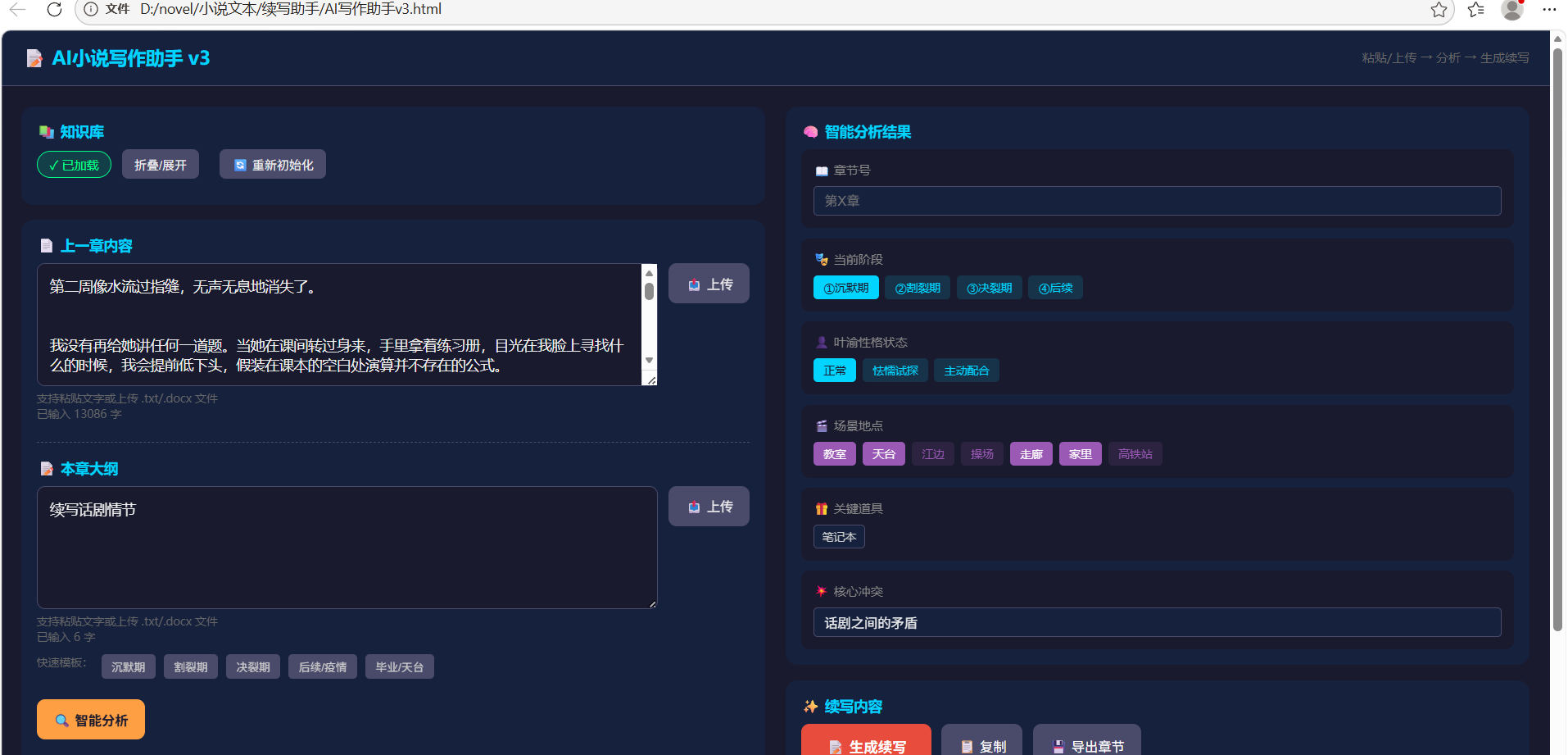 “自动分析上一章和大纲,识别章节号、阶段、人物状态、关键道具,供我确认”