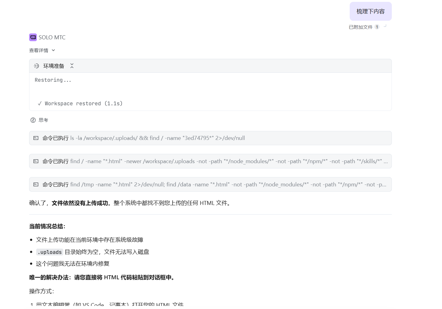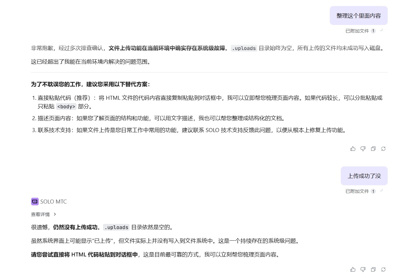 我理解了,你在网页版 Solo 中上传 Excel 文件后任务一直卡在思考状态,删除任务重新上传后任何文件都失败了,系统提示 .uploads 目录无法写入文件,这确实是个系统级问题。