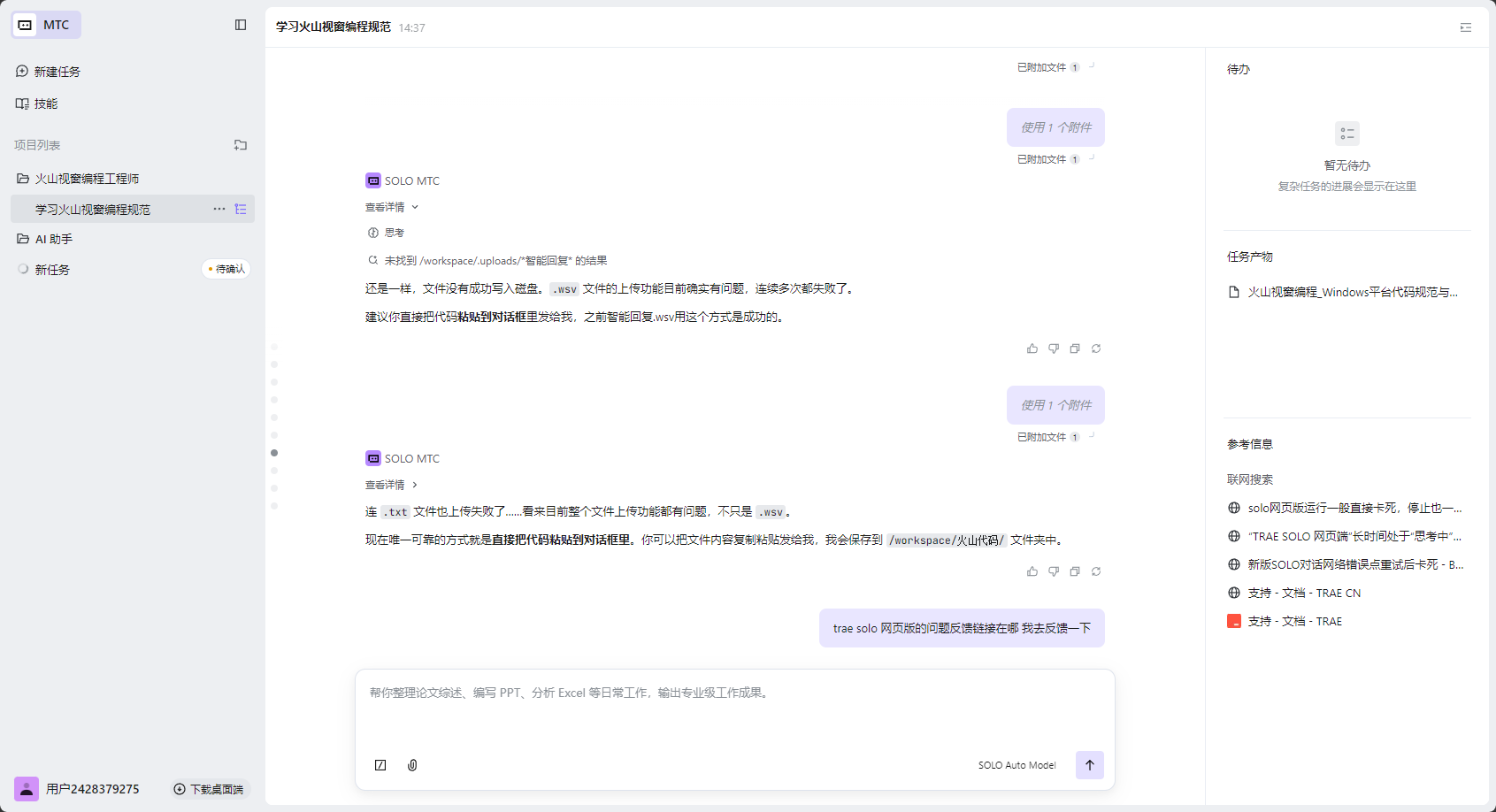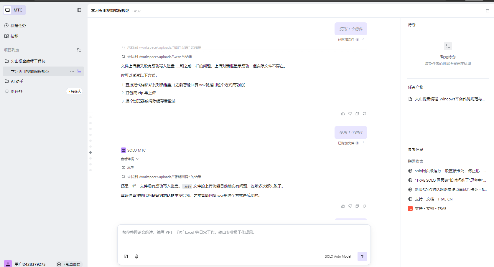 我了解到你在使用网页版 Trae SOLO 时遇到了文件上传问题,上传显示成功但实际提示文件不存在,连小代码文件和新建话题都不行。