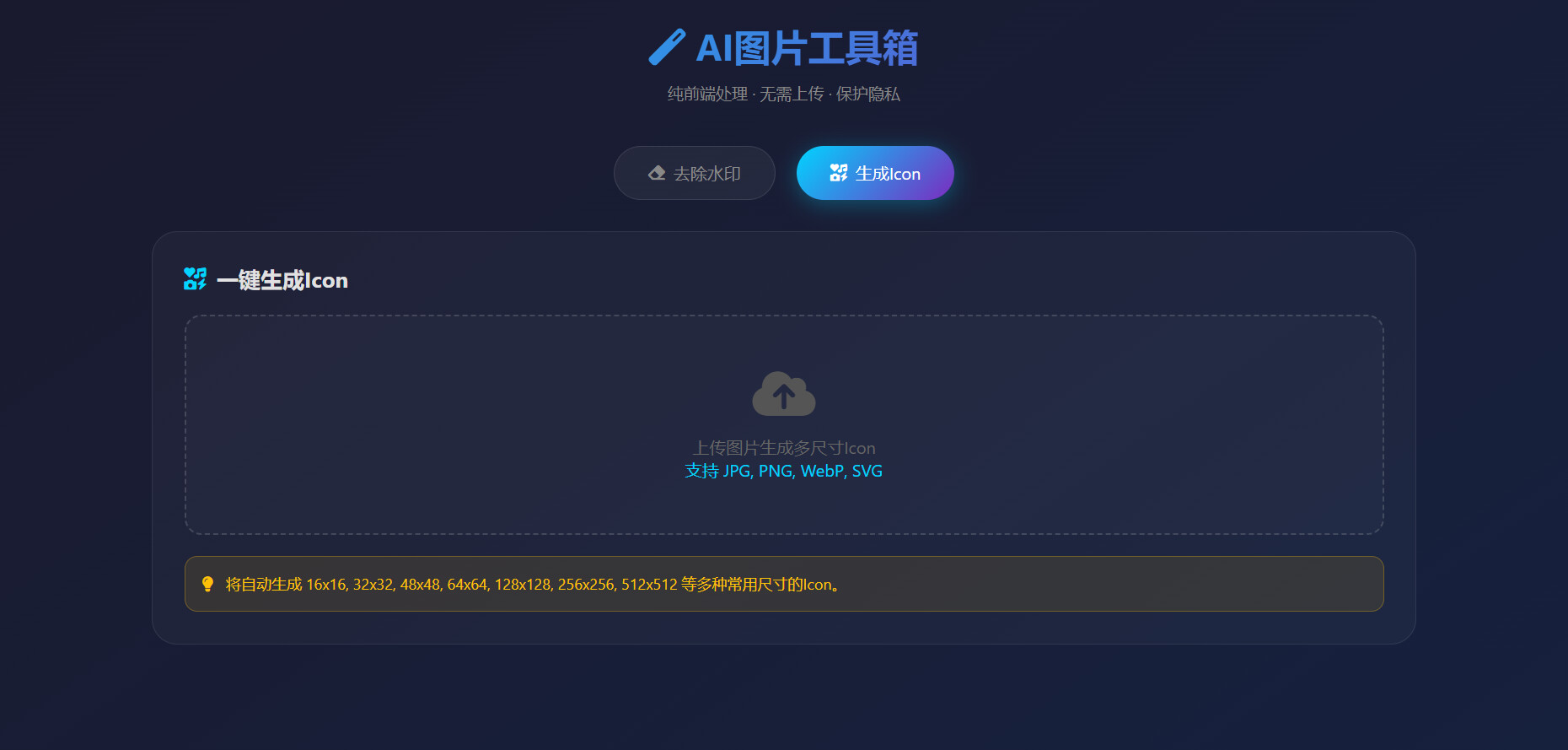 纯前端图片处理工具,包含去水印和生成Icon两个功能,无需服务器上传,保护用户隐私。