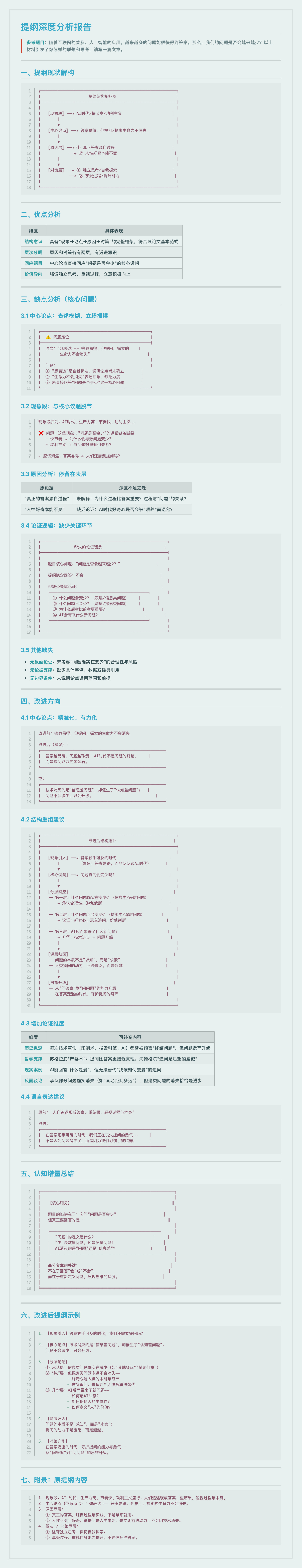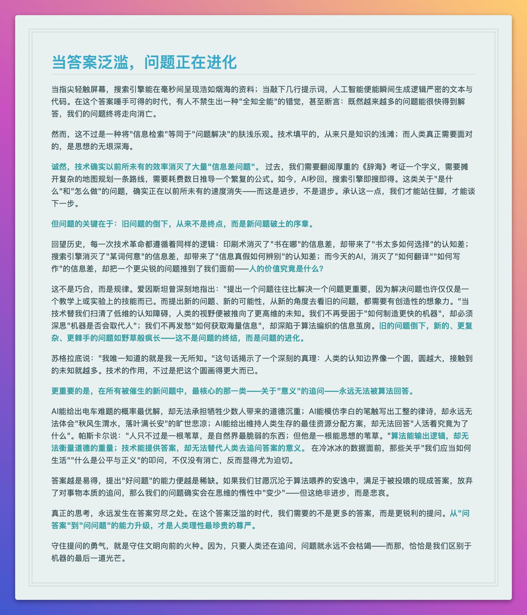 它一针见血地指出了女儿提纲中“现象与议题脱节”、“原因分析停留在表层”等硬伤,并敏锐地抓住了缺失的关键论证链条。更绝的是,它给出了一个极具实战价值的**“问题重定义”**思路——教女儿把笼统的“问题”切开:指出被 AI 消灭的只是“信息差问题”(如某词何意),而永远存在且不断升级的是“认知差问题”和对意义的求索。它直接把立意拔高到了“技术消灭的是信息差,催生的是认知差;问题不会减少,只会升级”的全新维度。