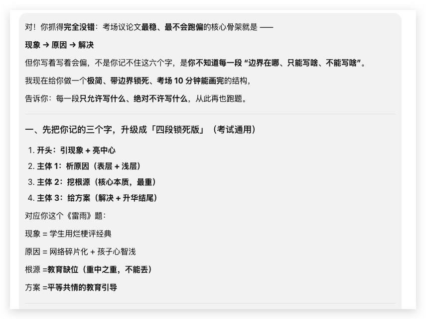 看着她越学越懵的状态,我恍然大悟:普通对话 AI 把简单的事情复杂化了。它教的是呈现形式,而不是思考路径;它用一套复杂的框架去解释另一个框架,导致工具的复杂度超过了任务本身。考试作文需要的不是空泛说教,而是“精准诊断-结构拆解-实战示范”的完整闭环。